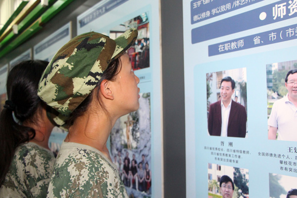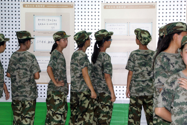 今天各班都参观了学校的陈列室,陈列室里,有三中的历史,三中的成就,虽然参观只有短短几分钟,解不了军训的累,解不了军训的热,也改善不了这枯燥乏味的军训生活,但是,它让同学们对三中的历史有了更深一层的了解。我校成立于1978年,是全省的30所省重点中学之一,省35所国家级示范性高中之一。拥有省内一流的现代化教学设施,有藏书12万册图书馆,设施一流的体育馆……与此同时我校还具有优秀的师资队伍,几十年来,他们培养出一届又一届的优秀毕业生,可以说是桃李满天下。我们有幸,今天下午在图书馆采访到19届12班的班主任。作为三中过去的学生,这位老师可以说是见证了三中的成长,对于三中有着不同于其他人的感情。在采访中,我们也了解到,面对这一群朝气勃发的新生,他们寄予着很大的期望,希望他们可以再造三中辉煌。自开校以来,三中也是英才辈出,在16年的高考中喜获三名状元!回首过去的几十年,三中得到了成长,成长的同时也收获了荣誉,看着陈列室里的奖状奖杯,各类荣誉称号数不胜数,让我,让新生,让我们为自己是三中学生感到骄傲!