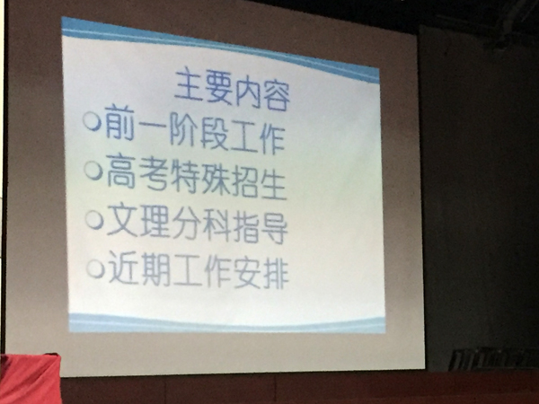 会上,年级代座城主任就高2020届年级本学期工作开展情况做了全面阐述,介绍了高考特殊招生的相关情况,重点进行了文理分科的指导,希望家长配合学校一起做好高2020届的文理分科工作,随后就年级近期工作安排做了一个简要介绍。