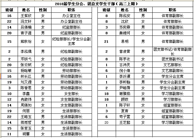 高2018届学生干部名单