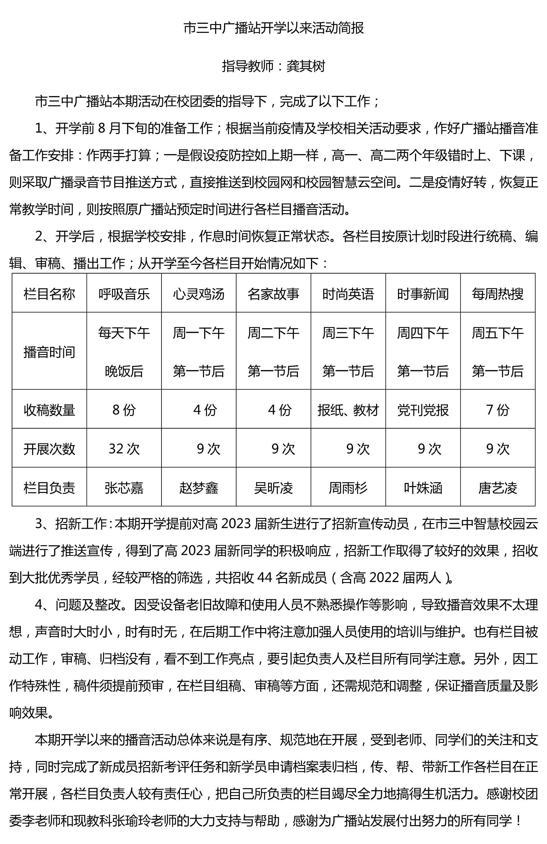 市三中广播站是我校优秀学生社团的代表。开学以来完成了以下工作;