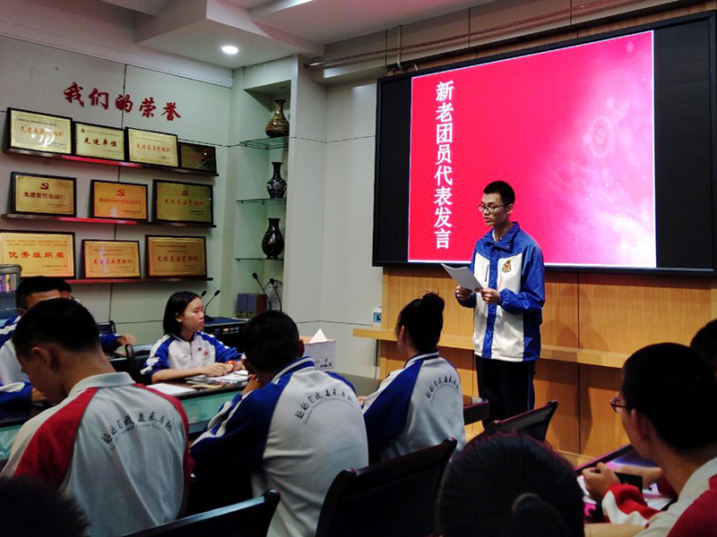 宣誓后,新团员代表吴佳谕发表了自己的入团感言,他感谢组织对新一批团员的培养和肯定,表示要用实际行动回报组织和祖国;老团员代表——高2020届年级团总支书记姜林玉给新团员们送上了勉励和期许,他首先对新一期加入组织的团员同志表示祝贺,他结合自身体会谈到和平年代青年们要做到“慎独”,加入组织后不应停止对自身的监督与省察,要时刻牢记团员身份,要团结起来,用实际行动让团歌更嘹亮,让团徽更加熠熠闪光。他们的发言字字句句,真诚动人。