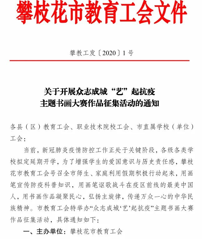 2月15日,攀枝花市教育工会发起《关于开展众志成城 “ 艺 ” 起抗疫主题书画大赛作品征集活动》(攀枝花市总工会女工部、攀枝花市教育科学研究所协办)。三中工会立即发出倡议,与校团委、年级一道,组织全校师生及其家人积极参加书画创作活动。