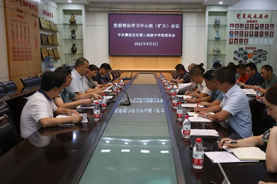 9月3日下午,市三中在图书馆一楼会议室召开党委理论中心组(扩大)会。校党委副书记、纪委书记罗学林同志组织大家学习习近平在中央党校中青干部培训班开班式上的重要讲话精神。校党委书记、校长李刚同志主持会议,校领导班子成员、全体中层干部参加会议。