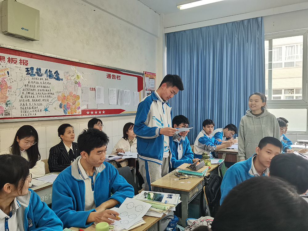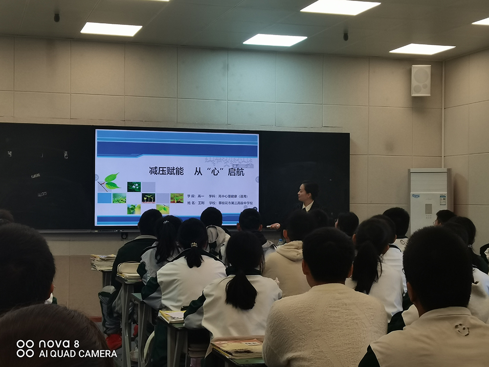 王利老师首先在高一六班开展了主题为“减压赋能,从‘心’启航”的班级团体辅导课程。王利老师针对在课搜集到的同学们现阶段的问题,从人际关系、学习考试、睡眠问题三个方面进行了讲解。在人际关系问题上,王利老师提出了“什么是真诚?”这一问题,引发了同学们的认真思考,并在这一基础上引出了人际交往的黄金法则:我希望别人怎样对我,我就怎样对他。在学习考试方面,王老师向同学们介绍了“三会”——会学习、会考试、会得分。会学习,以简单的拖拉机借力的小故事给同学们启示,成功的路上,要学会借力,不要只是努力,不要总是被动,要学会主动;要学会问问题;要学会持续性的积累能量,以期达到从量的积累到质的飞跃。会考试,考前要有准备,做好复习计划,完善知识点的覆盖;考中要注意认真读题和时间的安排;做完之后认真检查,并对答题内容确定是否需要修改。会得分,不要总是纠结于一道题,王利老师提出我们要学会实现总分最大化,在考试中学会取舍。最后的睡眠问题,王老师指出,要有规律的作息,尽量保持相对稳定的入睡和起床时间。王老师的解疑答惑受到了同学们的一致好评,课后同学们纷纷表示很有收获。