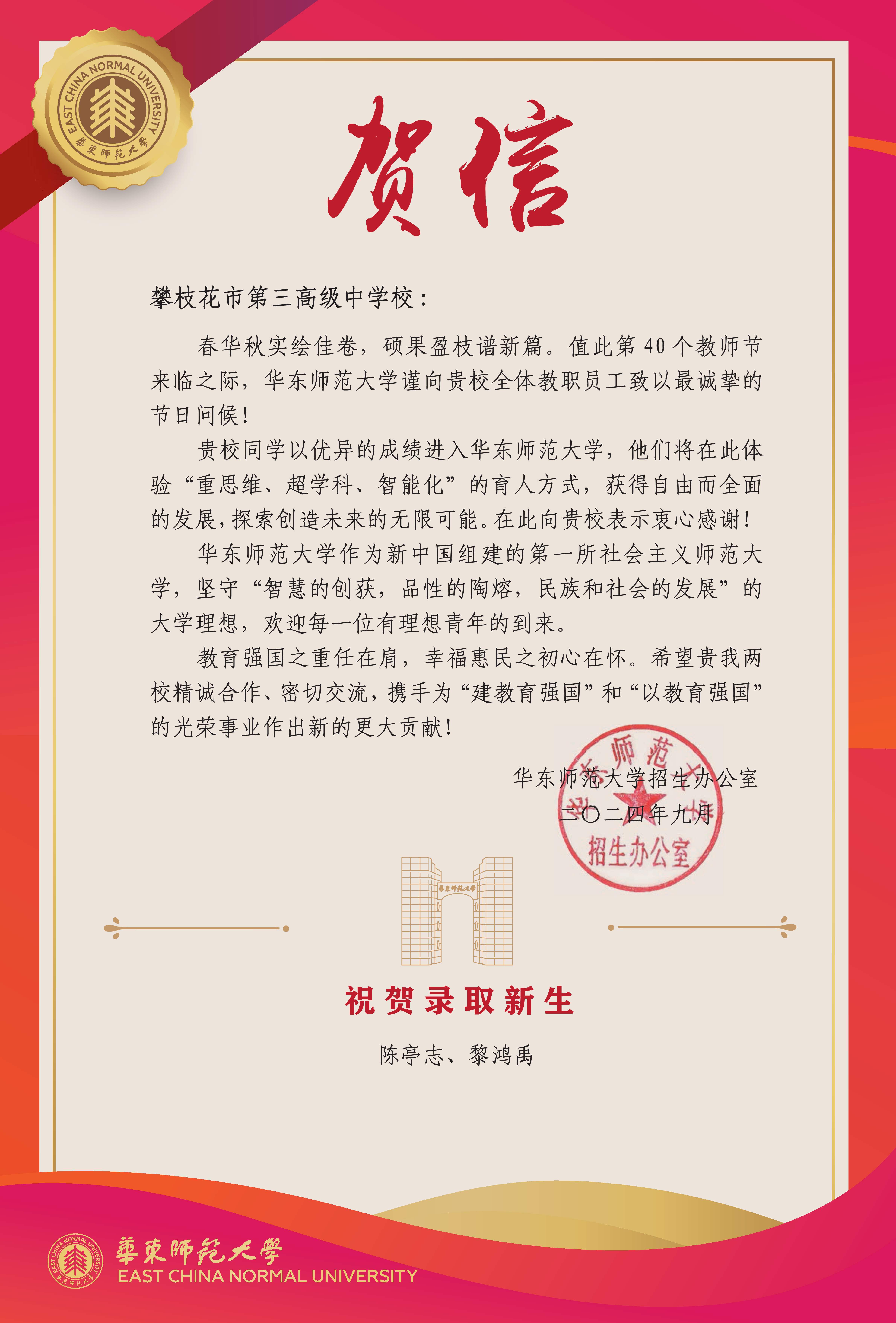 华东师范大学发来贺信!
