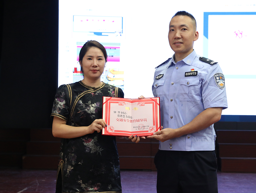 活动伊始,夏科长代表学校对钟华警官的到来表示了衷心的欢迎与感谢,并向钟华警官颁发了“交通安全教育辅导员”聘书。