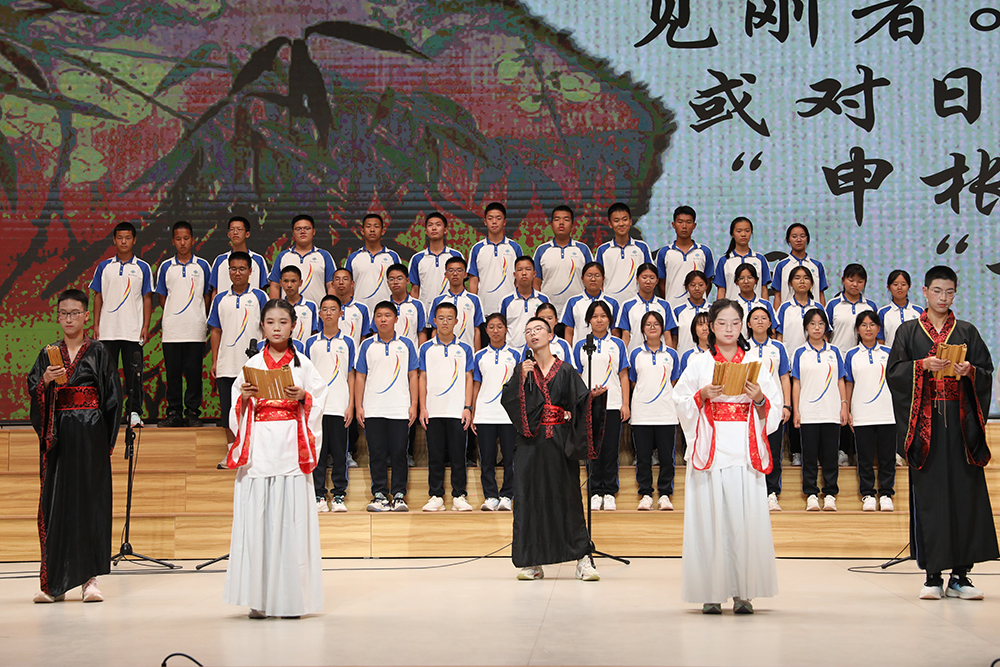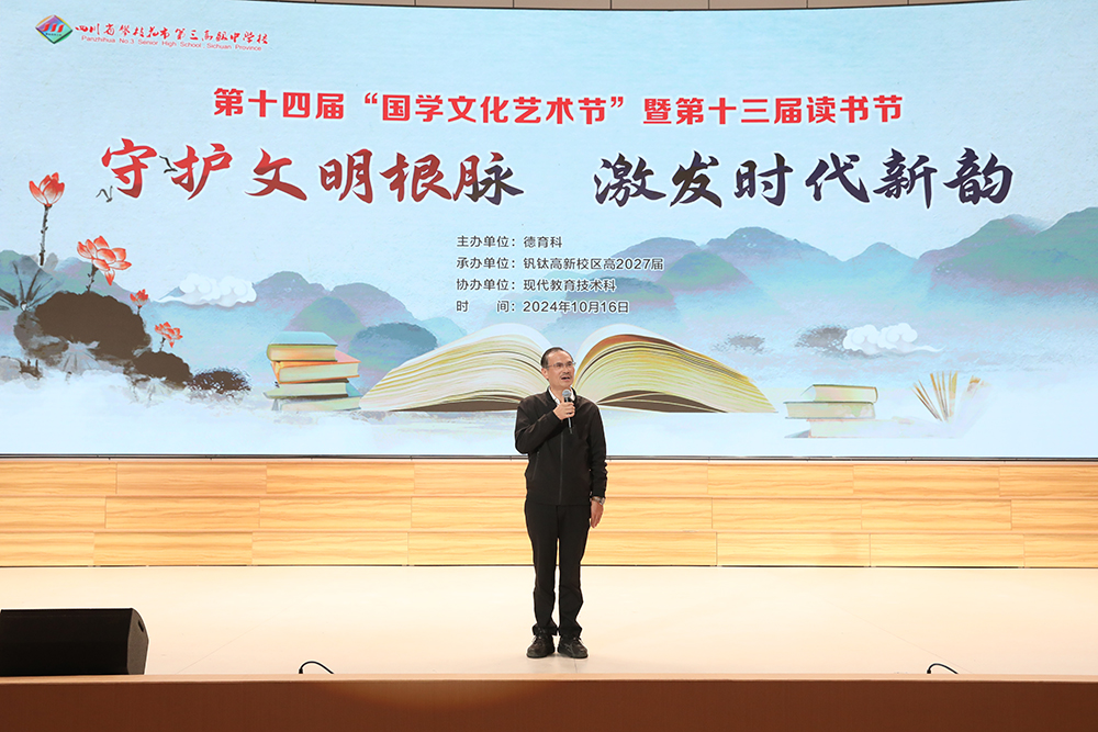 在热烈的掌声中,学校党委书记陈柏羽上台致辞。他赞扬为了这次活动不辞辛劳、默默付出的老师们、同学们和幕后工作者。其次,令人欣喜地看到同学们在这一个月以来所发生的显著变化,他们在知识的海洋中畅游,汲取着文化的养分,变得更加自信、更加沉稳。最后,着重谈到了文化自信这一重要主题,文化自信是一个民族、一个国家发展的基石,也是同学们成长道路上不可或缺的精神支柱。引导同学们深入认同三中的办学文化,“三色铸根魂,领航育新人”,它如同一股清泉,滋润着同学们的心灵;又如一座灯塔,为同学们指引着前进的方向,激励着同学们在求知的道路上不断探索,成为有根有魂、德才兼备的新时代新人。