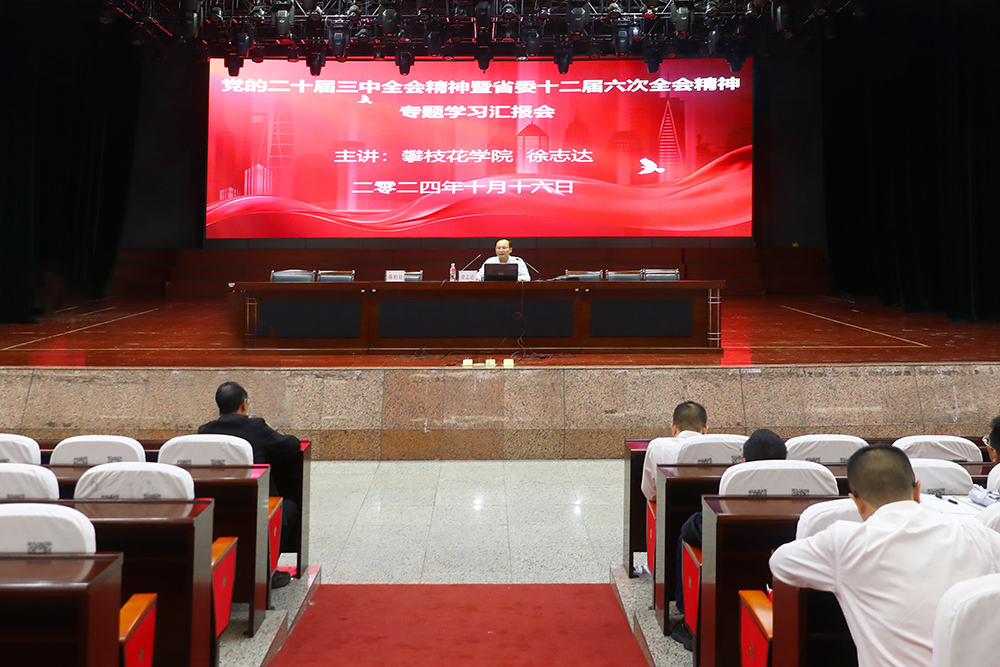 10月16日下午,攀枝花市学习贯彻党的二十届三中全会精神市委宣讲团第七分团(市委教育工委宣讲队)报告会在市三中图书馆三楼演播厅举行,攀枝花学院马克思主义学院马克思主义基本原理教研室主任、副教授徐志达对党的二十届三中全会精神作深入解读。市三中全体教职工参加学习,校党委书记陈柏羽主持会议。