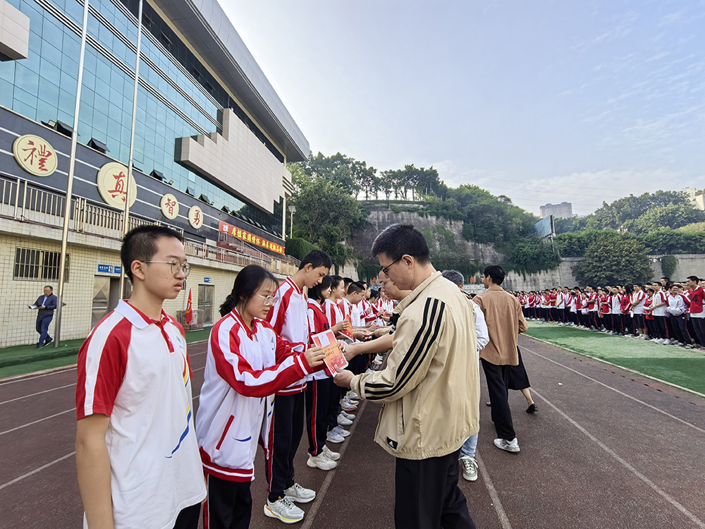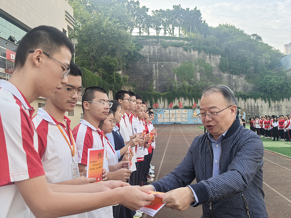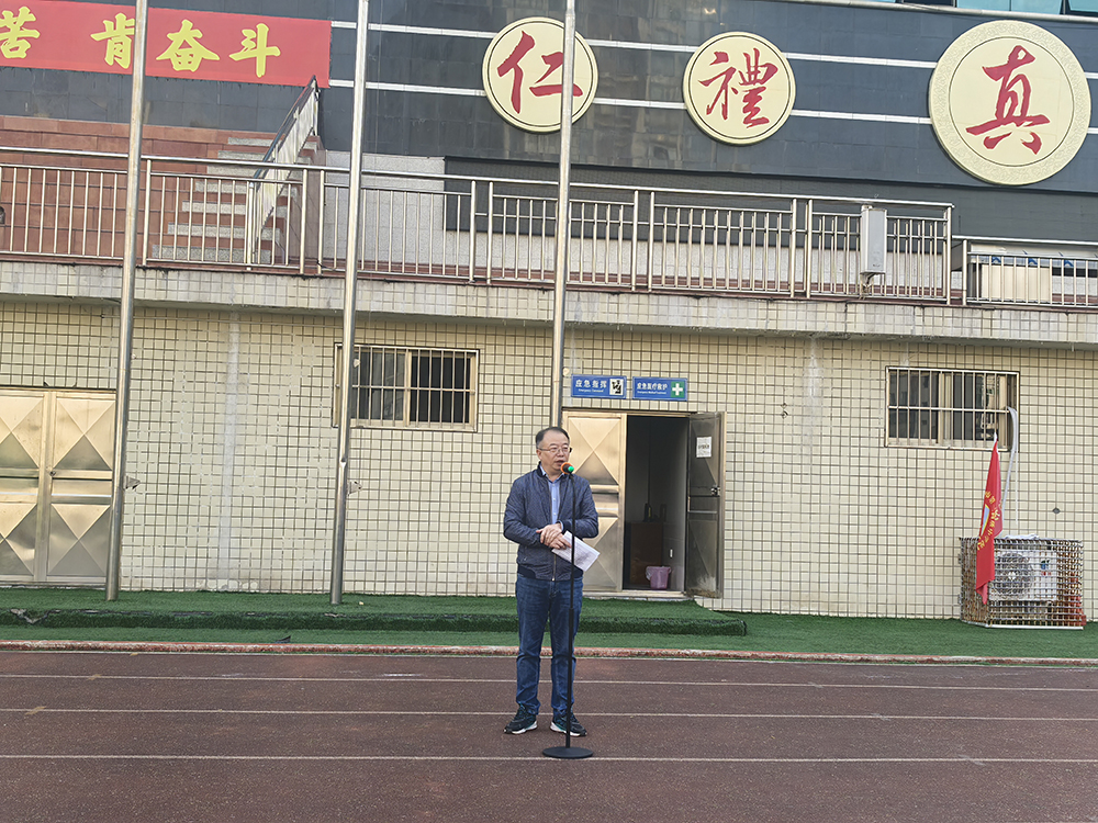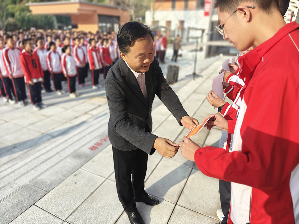 少年应有凌云志,当许人间第一流。新时代中学生应为热爱、梦想和荣光坚毅前行,努力追梦。税荣昌副校长结合运动员的拼搏精神向高2026届全体学子分享三个关键词:一是热爱,热爱是一个人取得成功的最强大动力,要携赤忱的热爱前进,不忘初心;二是信念,坚定的信念是取得成功的关键,要以坚定的信念迎难而上,不轻言放弃;三是责任,承担作为青年人的责任,要肩新时代青少年使命,努力展示三中学子的责任与担当。