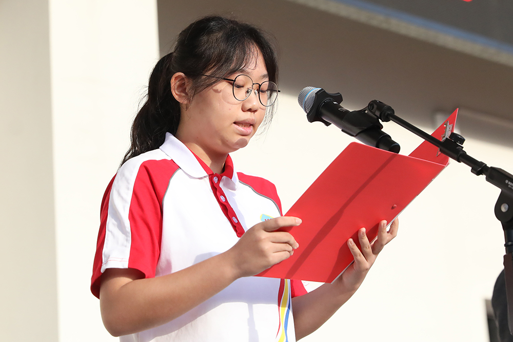 升旗仪式上,高2026届26班王心怡和4班谭茹馨同学做主题为“忆峥嵘岁月 颂英雄精神”的国旗下演讲,号召青年们在这个百年未有之大变局下,不畏强手,勇敢应对,弘扬“奋勇前进”的攻坚精神,不忘初心,牢记使命,为中华民族的伟大复兴而奋斗。