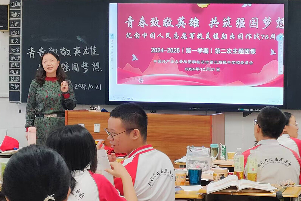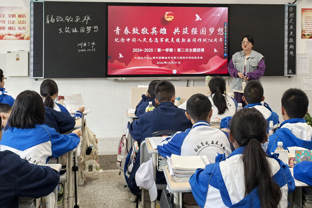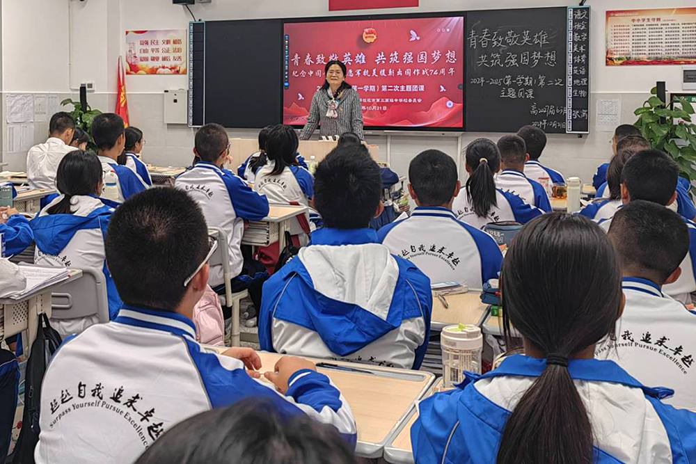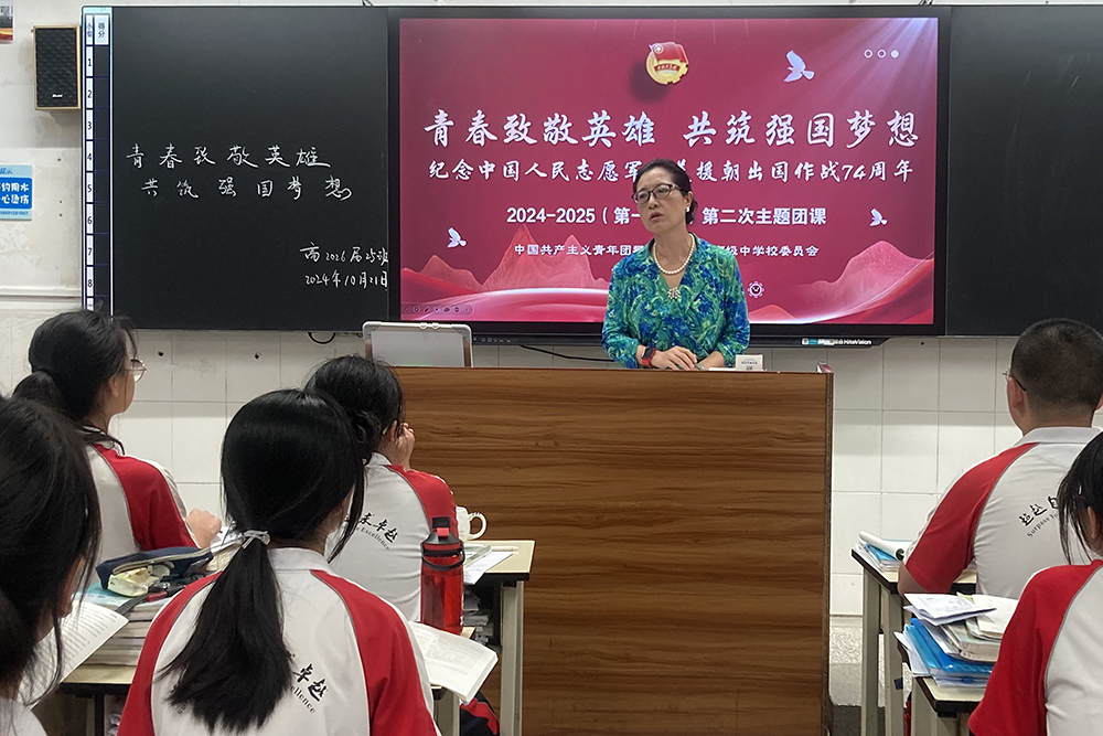 随后,各班党建带团建老师进班授课,结合历史事实和同学们讲述了抗美援朝的历史背景,带领同学们一起回到那段峥嵘岁月,致敬英雄。同学们也深受感染,一起讨论了“和平的意义”以及“如何传承英雄精神”等问题。