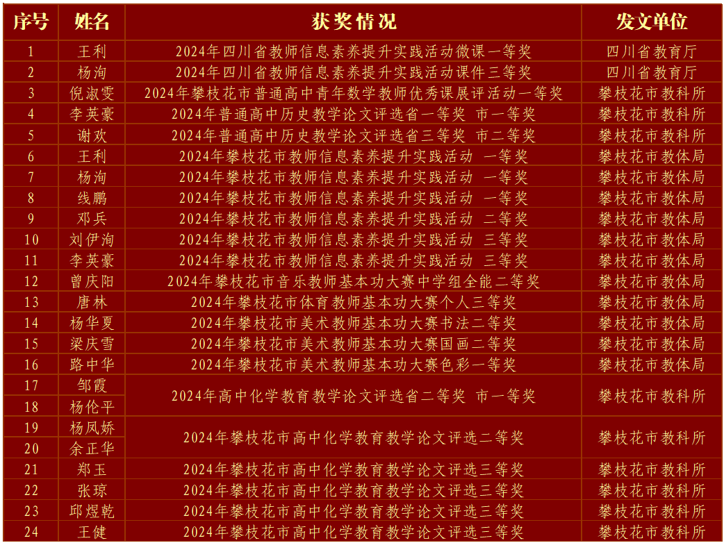 近日,四川省教育厅、攀枝花市教体局和攀枝花市教科所发布通知,买大小平台25名教师凭借专业的素养和扎实的教学能力荣获省级奖项6个(一等奖2名,二等奖2名,三等奖2名),市级奖项19个(一等奖6名,二等奖6名,三等奖7名)的优异成绩。