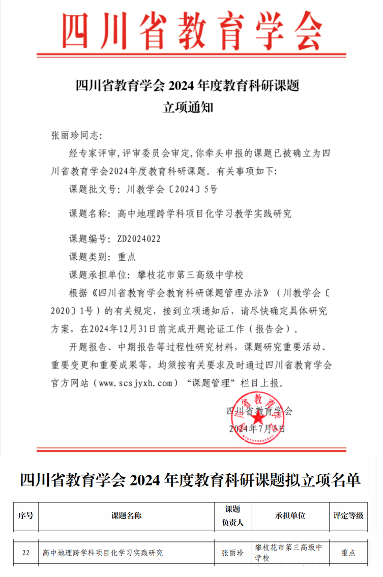近日,经四川省教育学会严格审核,由张丽珍教育体育专家团队牵头的《高中地理跨学科项目化学习教学实践研究》已成功立项,并获批重点课题。