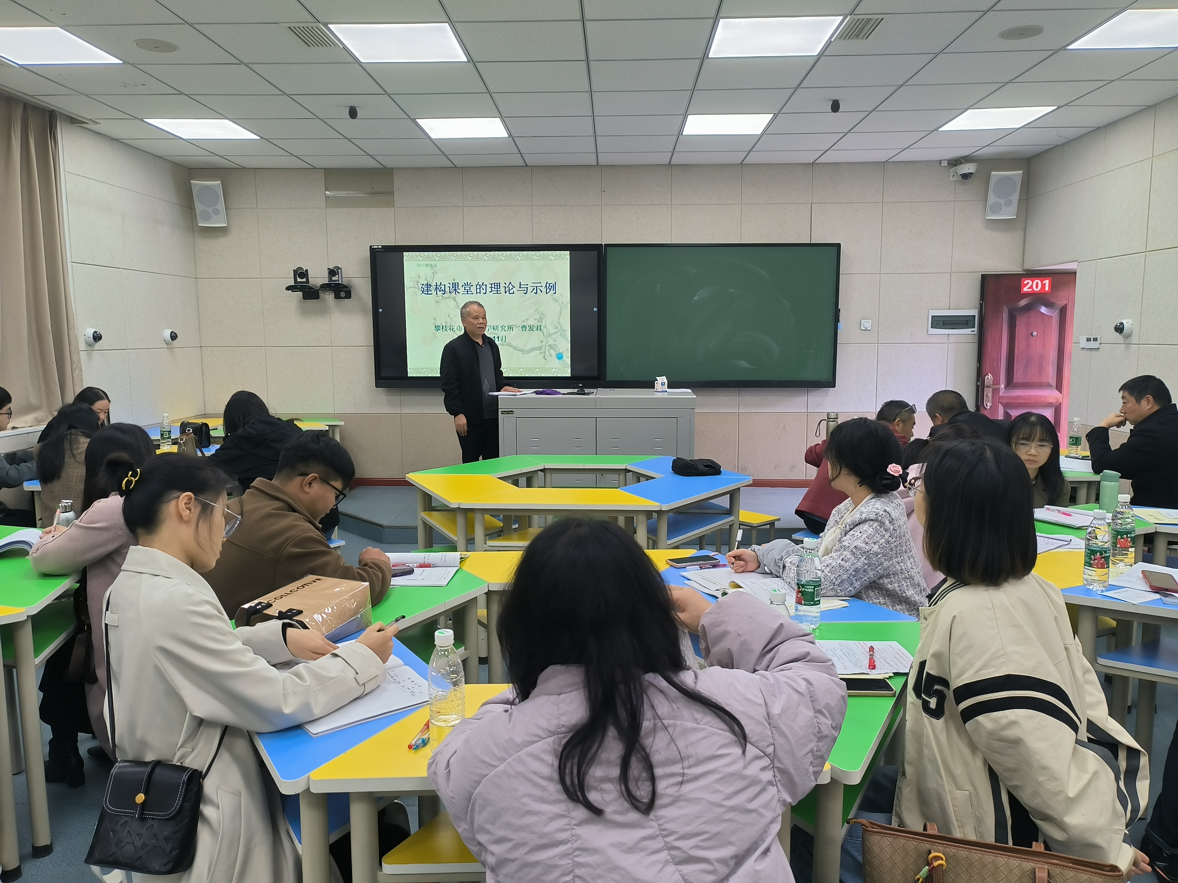 生物学科教研员、中学生物名师工作室领衔人曹发君老师开展了主题为《建构课堂的理论与示例》的专题讲座,以《孟德尔的豌豆杂交实验(二)》为例,强调支架式教学是最主要的教学方法,需要从搭建框架、进入情境、进行探索、合作学习和效果评价五个环节展开教学。他强调教学设计应是针对学习环境的设计,所有的教法都应该以学生为中心。