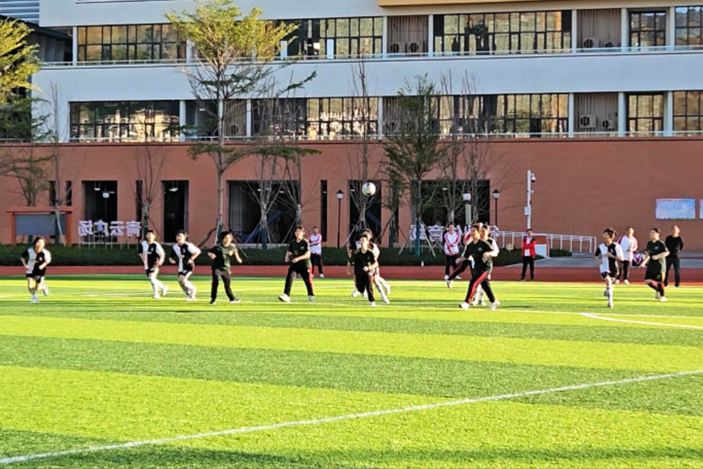 比赛在现场的一片欢腾中拉开帷幕。蔚蓝晴空下,身着黑白球衣的1班队员与身着墨绿球衣的2班队员势均力敌,相互对峙;白色球网前,一道道身影飞掠闪现,编织成绚丽的画卷;青绿的草坪上,球在一双双迅疾有力的脚间来回翻腾。