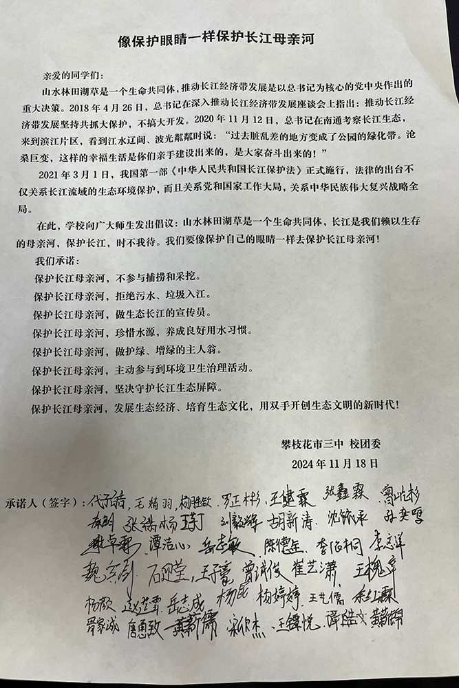 最后,同学们在“像保护眼睛一样保护长江母亲河”的倡议书上签名,承诺以实际行动保护长江。