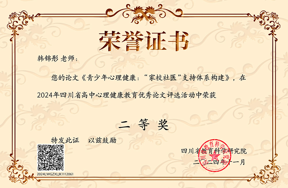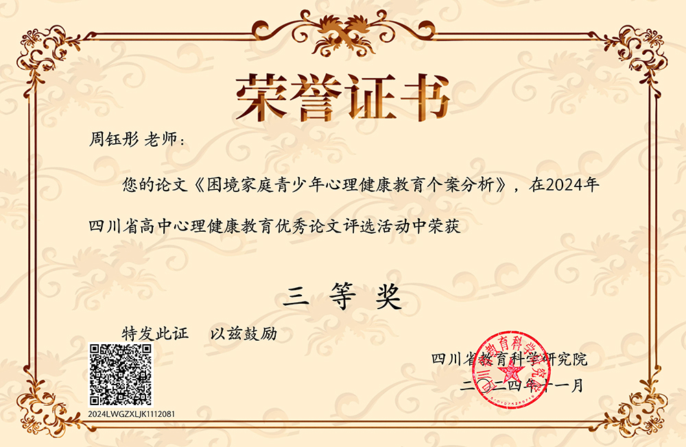 在“四川省 2024年高中心理健康教育优秀论文评选活动”中,市三中组织心理教师积极参与,凭借出色的研究成果和扎实的专业素养成功斩获佳绩!