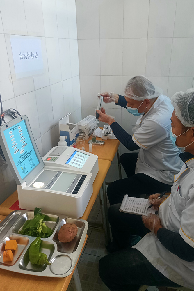 另外,学校还运用多功能食材快速检测仪开展食材快检,确保食材化学检测和微生物检测合格,有效杜绝问题肉、瘦肉精、地沟油、蔬菜农药超标、过期大米等劣质食材流入食堂。食材检测结果通过互联网实时上传至监管系统,检测结果一经发现监测值超标异常的,系统自动产生报警,把好食材安全第一关的同时做好数据留痕。