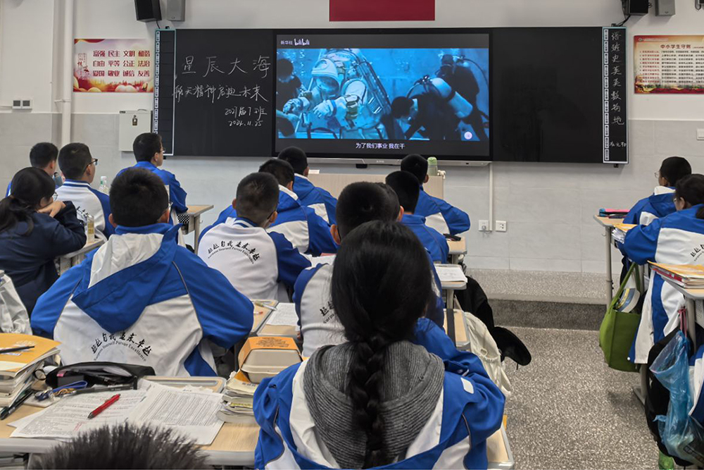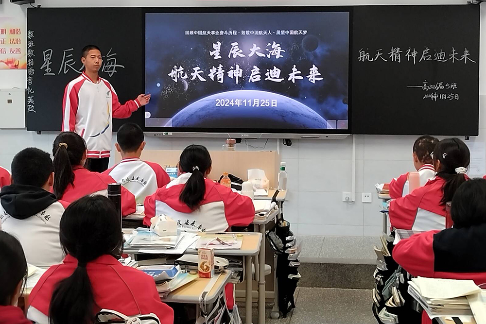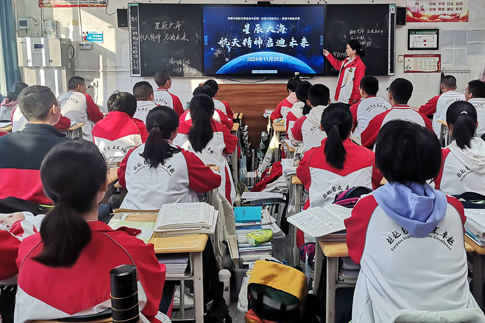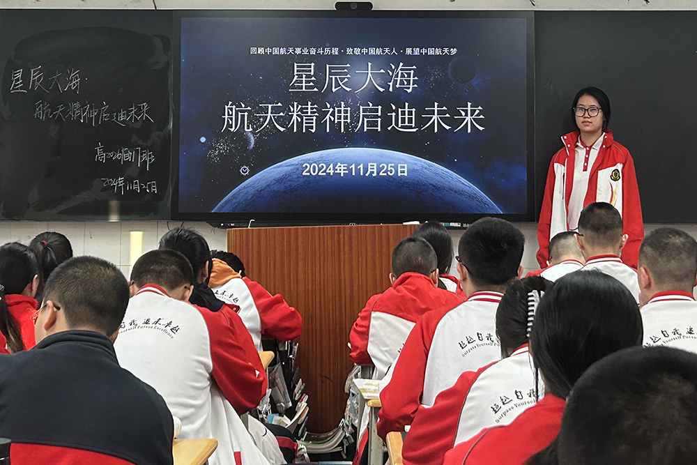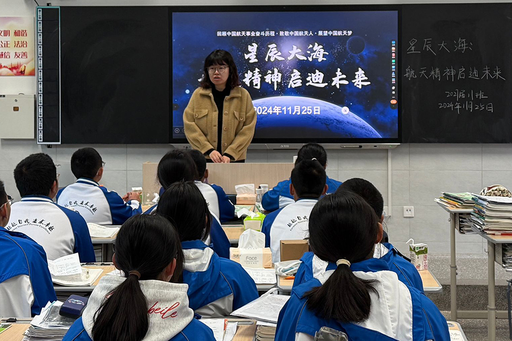有的班级邀请物理老师为大家讲解航天科技的基础知识;通过观看航天员的纪录片,了解中国航天员的训练过程和太空生活,感受他们不畏艰难、勇于探索的精神;一些同学则向大家推荐了一系列航天主题的书籍,如《月亮上的环形山》、《远方的火焰》等;并借此契机,分享了自己的航天梦想。