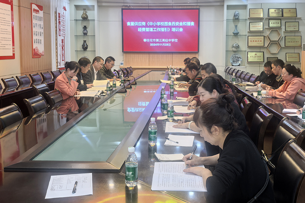 2024年11月25日下午,市三中组织食堂食材供应商在图书馆一楼会议室开展《中小学校园食品安全和膳食经费管理工作指引》学习培训会。食堂食材供应商、食堂库管、食材验收及相关管理人员参会,会议由食品安全总监伍学文主持,校党委副书记、校长代座城出席会议并讲话。