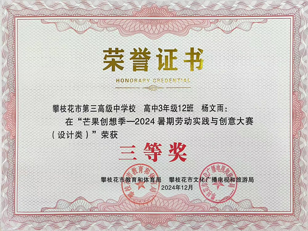 劳动,作为中华民族的传统美德,具有树德、增智、强体、育美的多重育人价值。学校立足于劳动教育目标和要求,积极开展系列劳动教育活动,提升学生劳动素养,在攀枝花市“芒果创想季—2024年暑期劳动实践与创意大赛”中,凭借扎实的技能、出色的作品,荣获“优秀组织奖”;夏忠春老师荣获“优秀组织教师奖”,十名同学获得个人奖项。