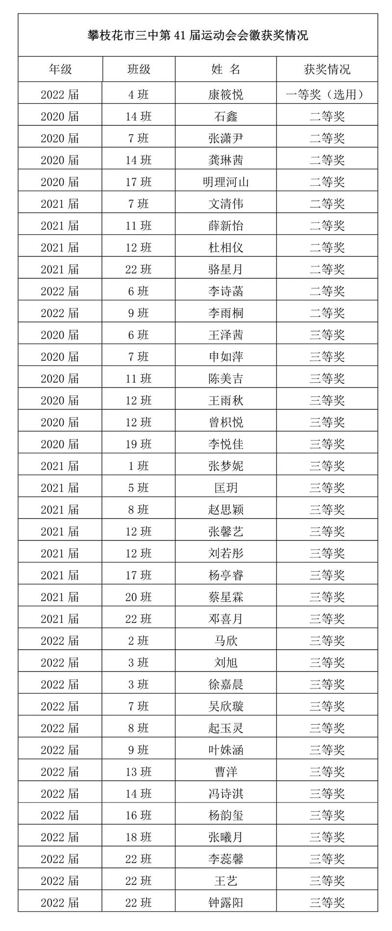 自学校第41届体育文化节会徽征集通知发出以来,全体同学积极参与设计、投稿,共收到有效作品高2020届45份,高2021届36份,高2022届46份,共计127份。经过认真严谨的评选,获奖情况如下: