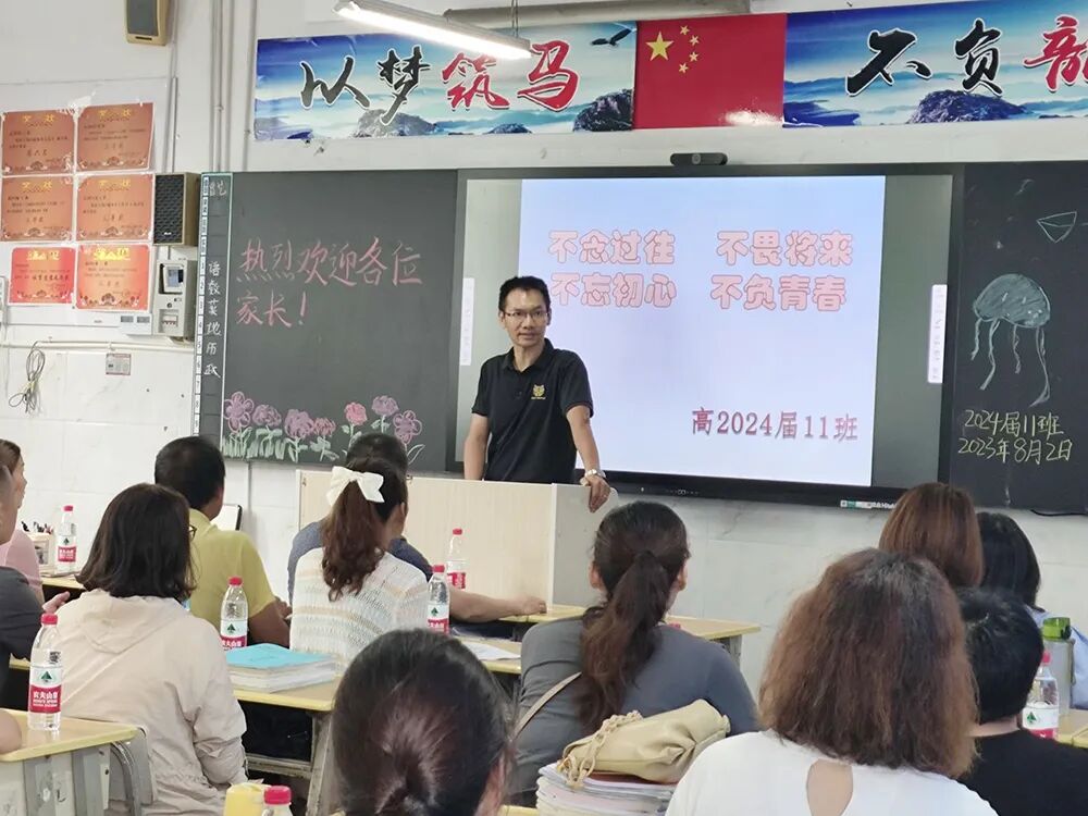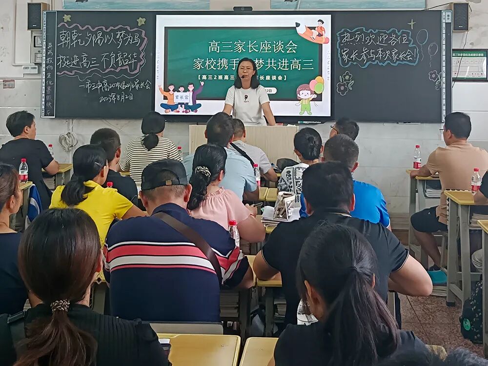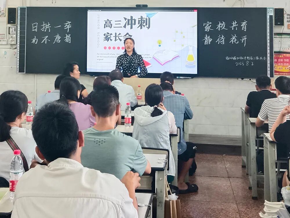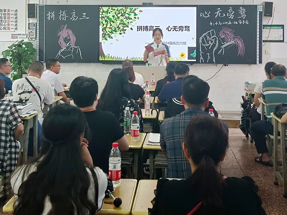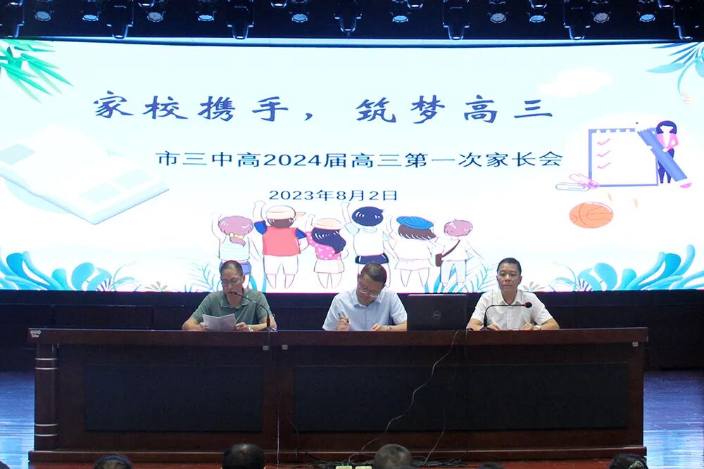 分管高2024届的副校长伍学文发表“家校携手,同心同行”主题讲话,伍校长首先通报了市三中2023届优异的高考成绩,并结合2024届高二下学期期末统考成绩分析高2024届学生的发展优势,随后从信任、沟通等多个角度指导家长如何当好一名“高三家长”:应坚定必胜信心,相信孩子的能力和潜质;强化家庭教育,努力提高家庭教育的质量;家长要当好后勤部长,为孩子高考保驾护航。