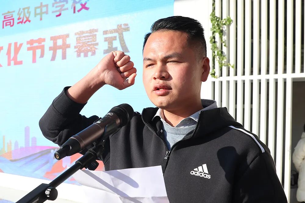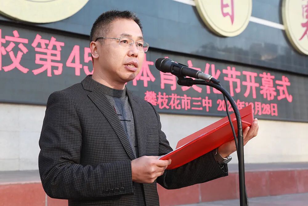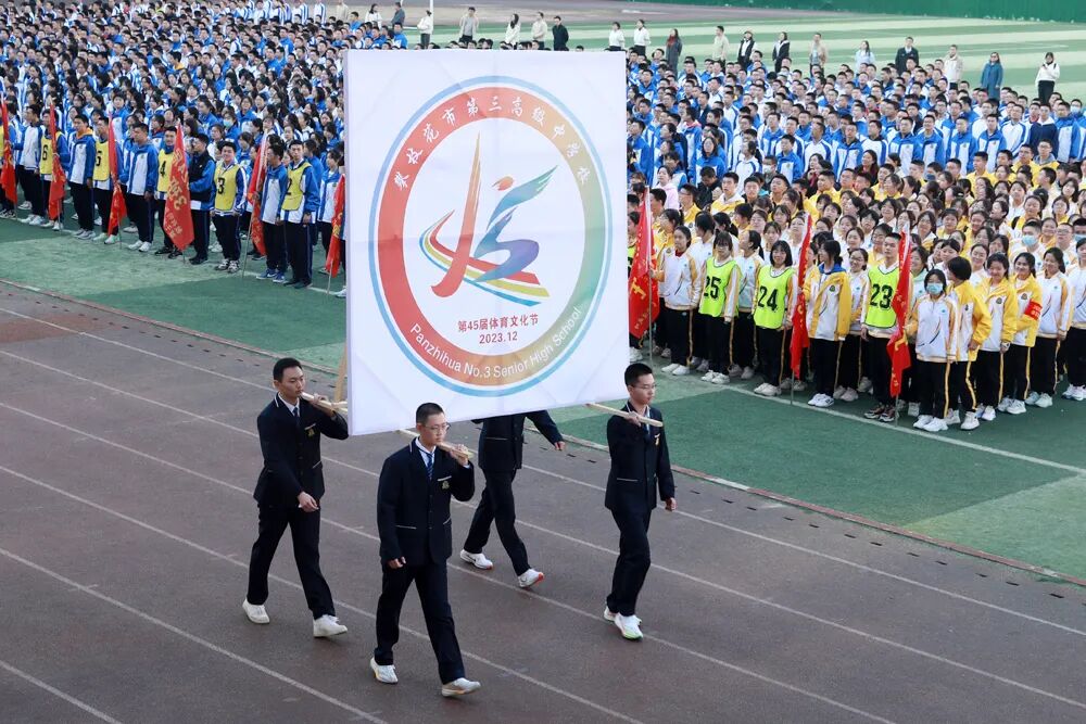 入场仪式完毕,全体师生起立,高唱中华人民共和国国歌、市三中校歌。随后,何先全副书记(钒钛校区)、郭志洪副校长(学园路校区)宣布本届体育文化节会徽征集获奖情况。代座城校长为获得第一名的高2025届1班李德阳同学颁奖,其他领导为其余32名获奖同学颁奖。接着是运动员代表和裁判员代表宣誓环节。