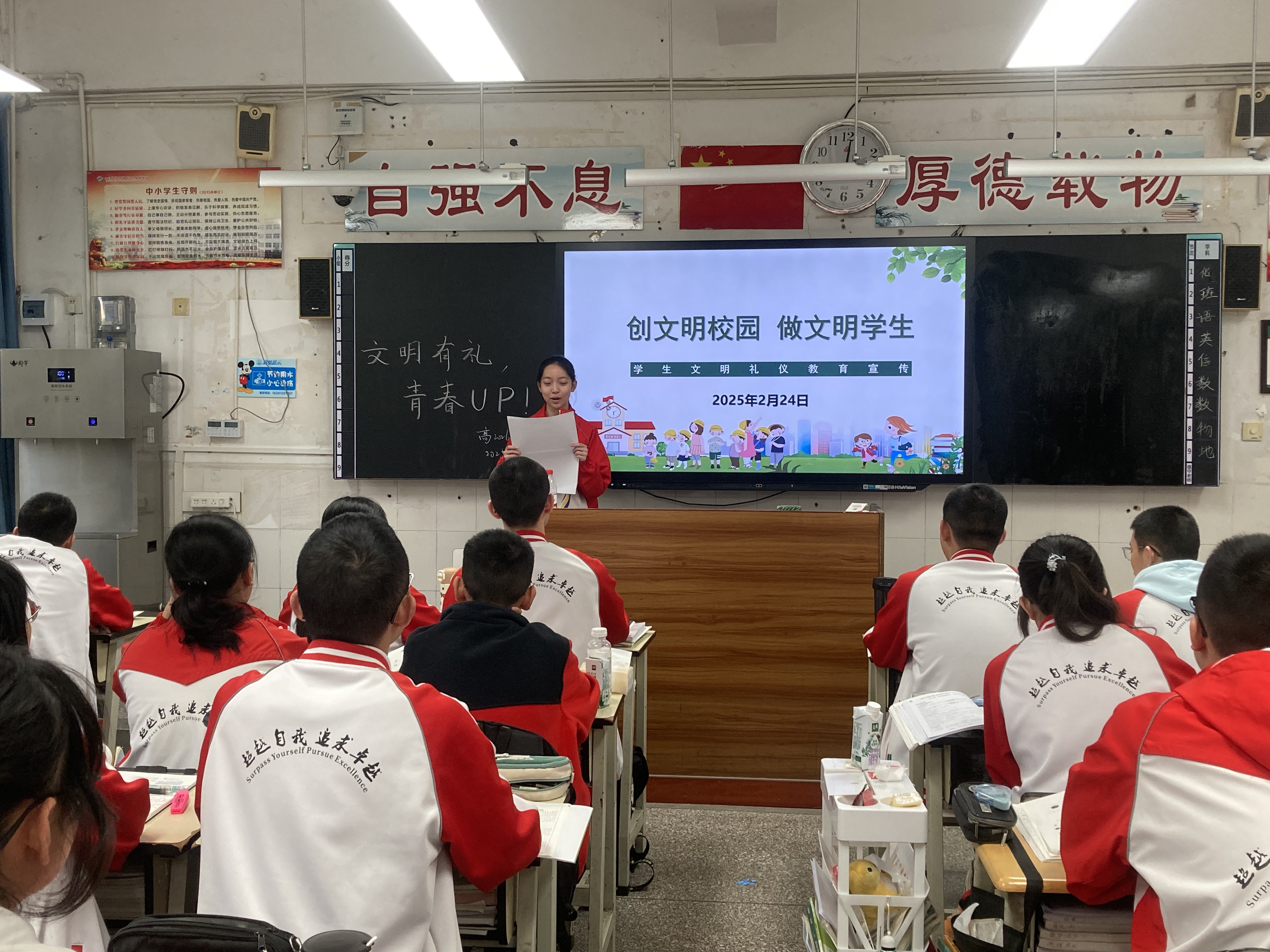 升旗仪式结束后,各班立即开展了以“文明有礼,青春UP!”为主题的班会活动。在班主任的组织下,同学们认真学习讨论了文明礼仪相关案例,积极参与文明行为知识竞答,并共同签署了“文明伴礼仪我行,青春风采我展现”倡议书,郑重承诺将文明礼仪融入日常学习与生活。