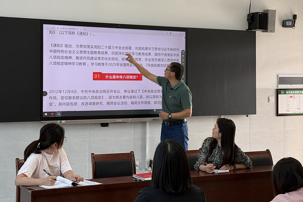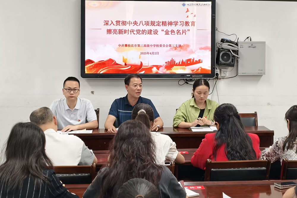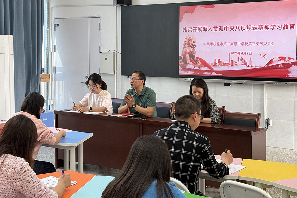会议强调,要重点学习中央八项规定的“改进工作作风、密切联系群众”等相关内容,要落实中央八项规定的实施细则,提高党性觉悟,严守组织纪律,做到心中有责、行为有度、服务有情,在思想、工作和作风等方面提升进步,弘扬教育家精神,做新时代好教师,扛起“两试引领、五市并进、共富共美”的责任担当,为加快推进区域优质教育中心建设和攀枝花共同富裕试验区建设贡献三中力量。