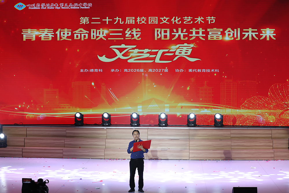 4月16日,市三中钒钛高新校区高2026、2027届学生齐聚敬业楼演播厅参加第二十九届校园文化艺术节文艺汇演。校党委班子成员、师生及家长代表共同出席晚会。本届校园文化艺术节围绕“青春使命映三线,阳光共富创未来”主题精心编排节目,展现三中学子的青春阳光形象,呈现新时代青年的堪当大任风采。