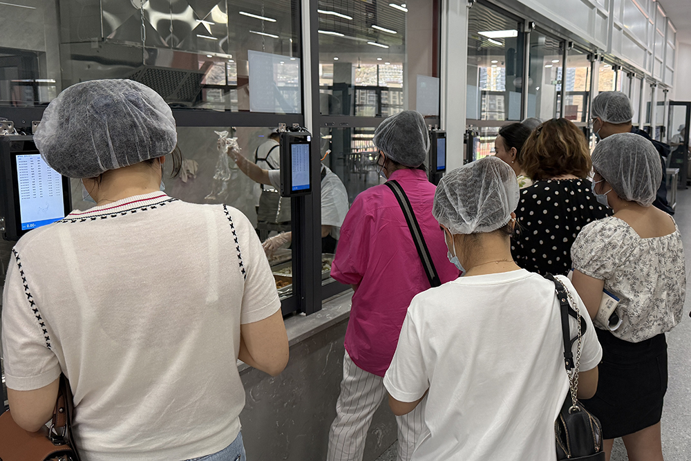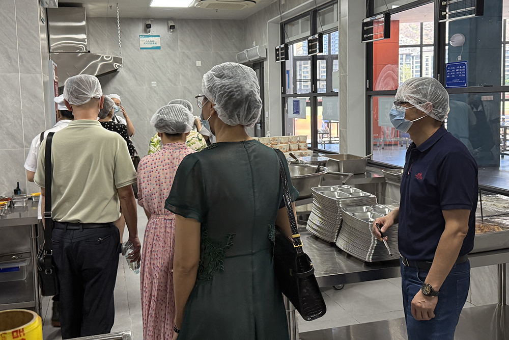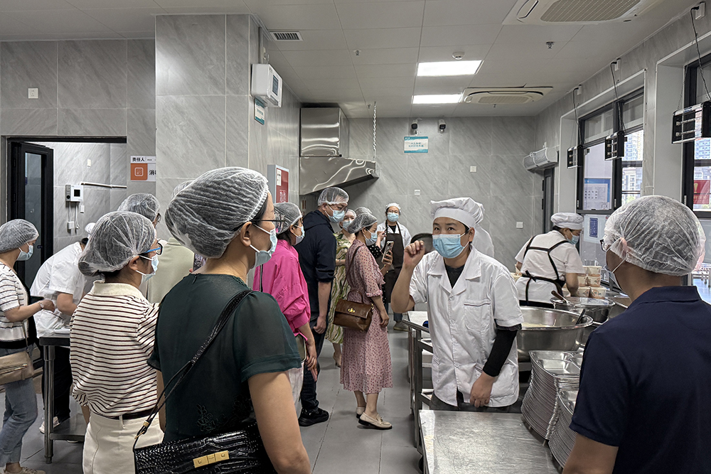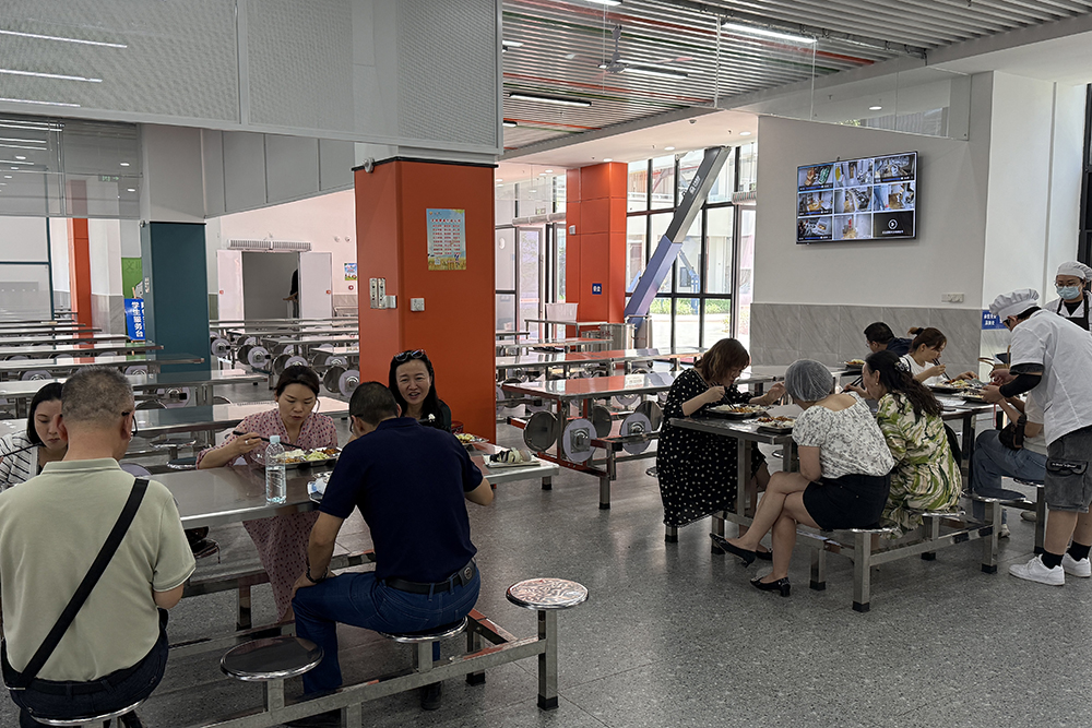 家长代表受食堂邀请观摩食堂收菜、净菜、备菜、炒菜等流程,品尝营养均衡的荤素菜品,体验良好的就餐环境,协同年级、食堂组织学生错峰就餐,全方位、全流程关注学校食品安全和学生有序就餐情况。