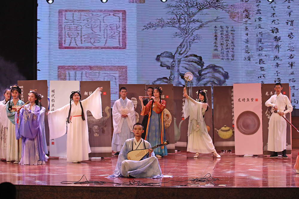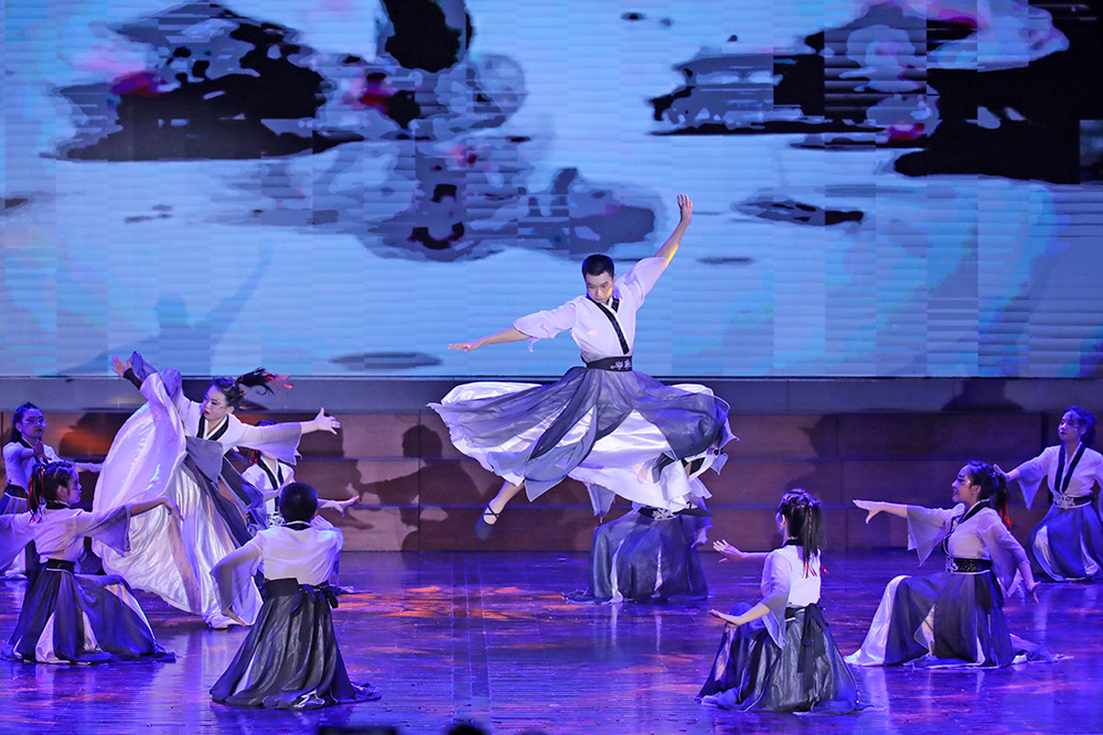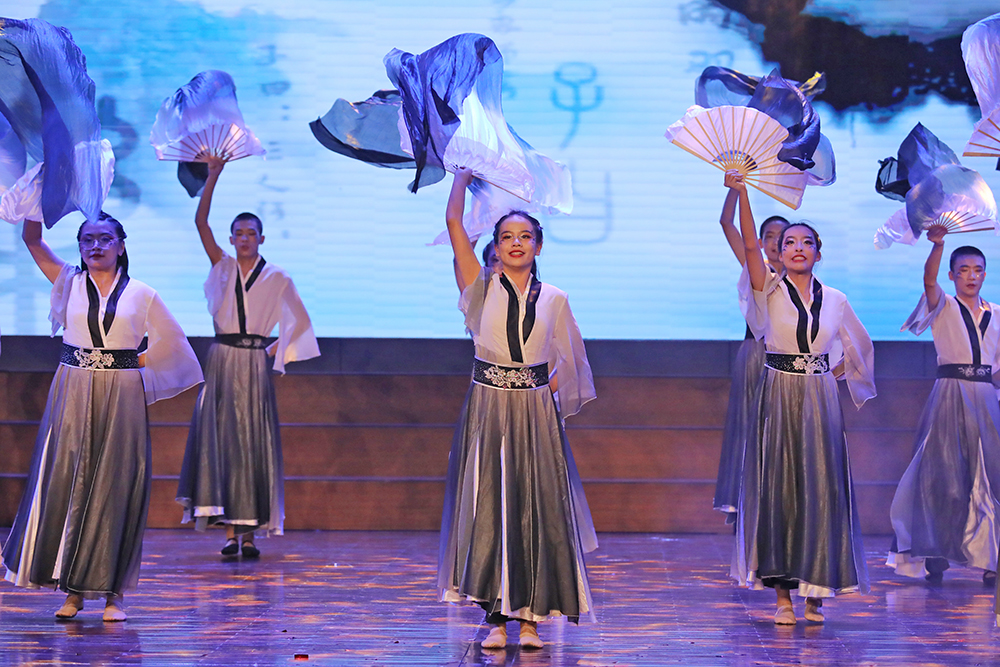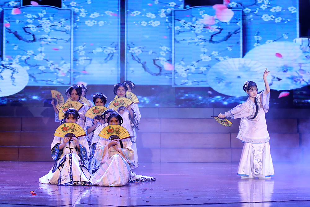 《麟颜戏舞》中,演员指尖轻捻,瞬息间脸谱飞换,赤焰自喉间喷薄如虹。当传统戏曲的程式化身段撞上先锋编舞的解构张力,折扇开合划出赛博光影,台步挪移踏响电子鼓点,古老戏韵在当代律动中破茧重生,演绎一场跨越时空的艺术对话;《砚魄流觞》则以书法韵律为魂,勾勒出东方美学的独特神韵,每一个节目都成为文化传承与创新的生动注脚,彰显着同学们对传统文化的深刻理解与创新演绎。