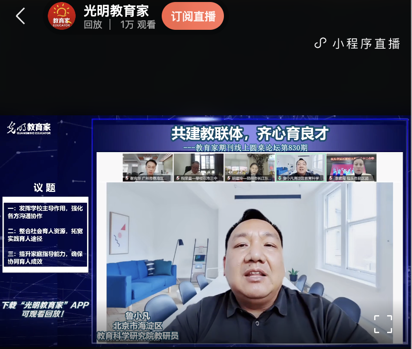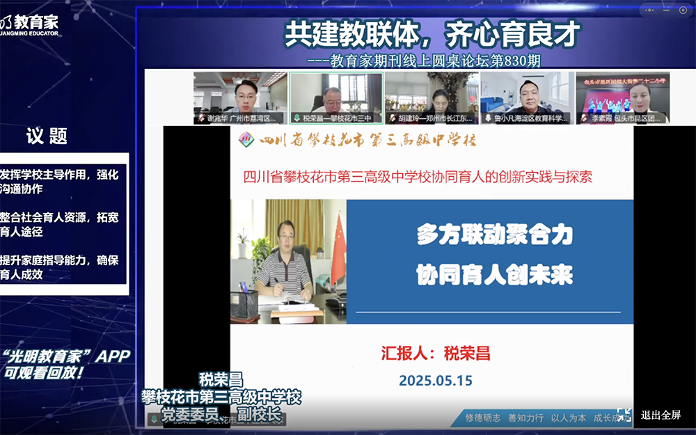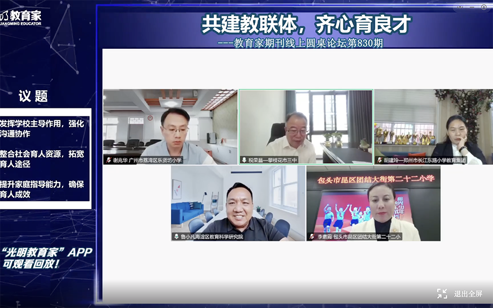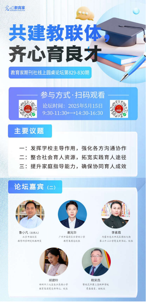 2025年5月,光明日报《教育家》杂志社主办的“共建教联体,齐心育良才”线上圆桌论坛成功举行。论坛聚焦家校社协同育人“教联体”建设,分为主题发言与自由研讨两个阶段。