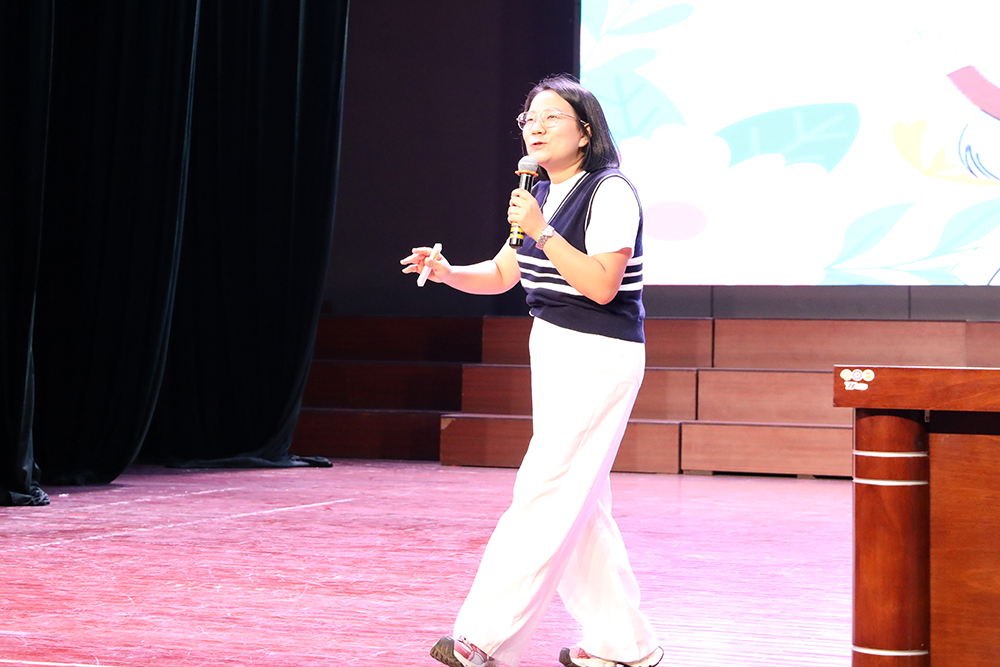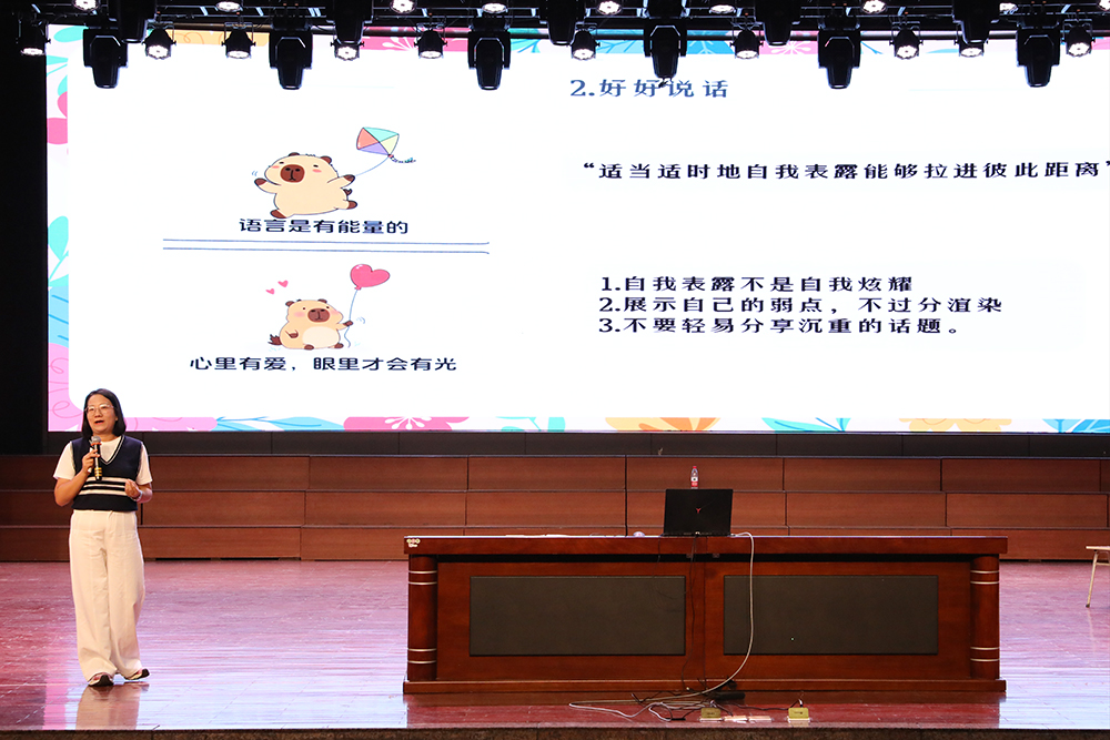 讲座现场气氛热烈,开场便以一系列精心设计的互动热身游戏迅速点燃了同学们的热情。首先,在学习提升人际技巧同时用行动表达了对于同学、同伴的感谢。“友好按摩”环节,在欢声笑语与温柔放松中,同学们深刻感受到了支持、和谐和友善。接着蒋老师讲到了同学们在友谊的困惑:友谊之塔:“不是所有的朋友都是知心好友”、“知己可遇不可求”;友情的相处之道:求同存异,勇敢的表达“不”;和而不同,友谊长久;面对渐行渐远的友谊,不要刻舟求剑等。最后她还分享了,好的友谊是互助的、友善的、有情绪价值的,可做真实做自己的。