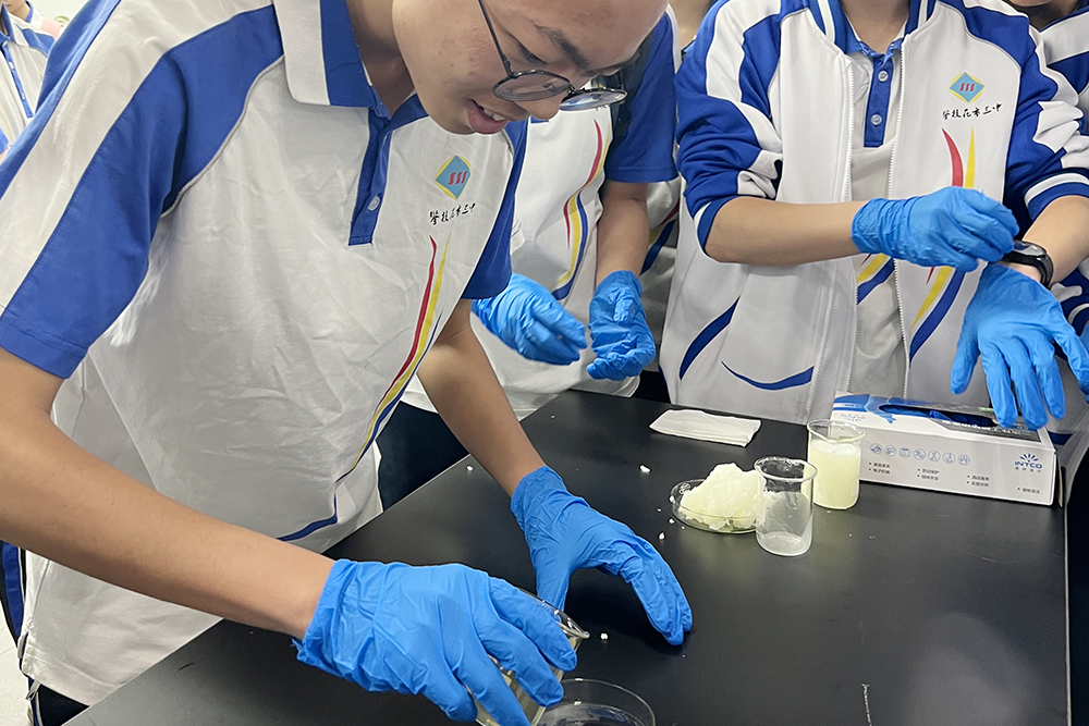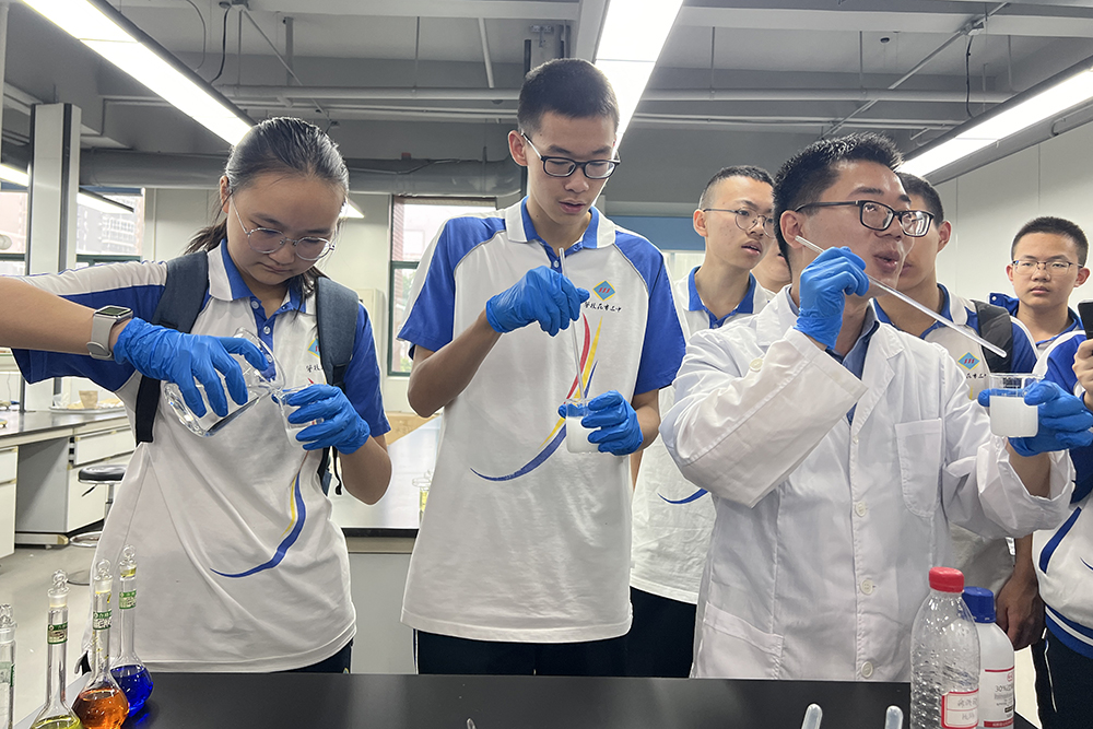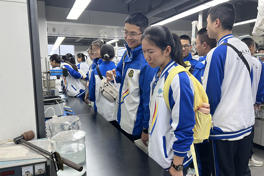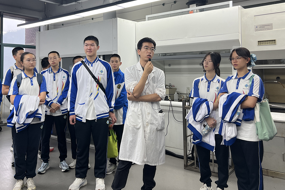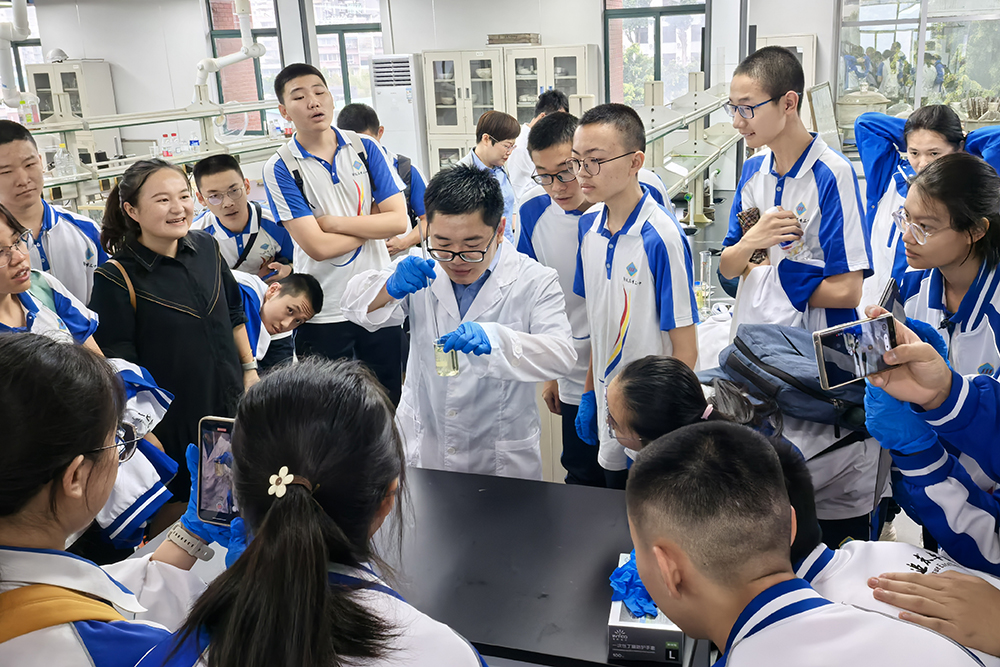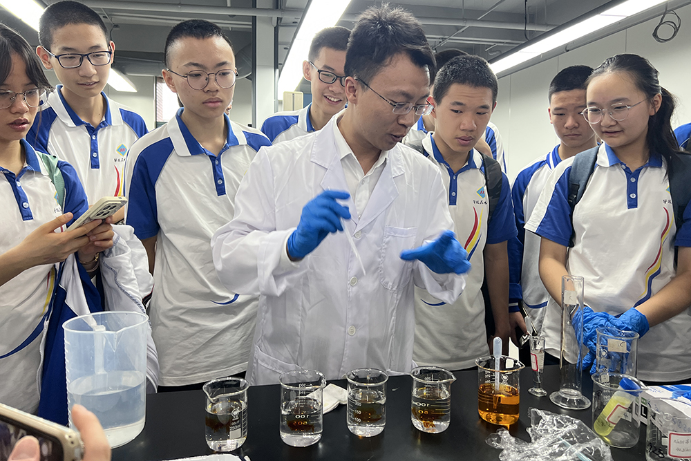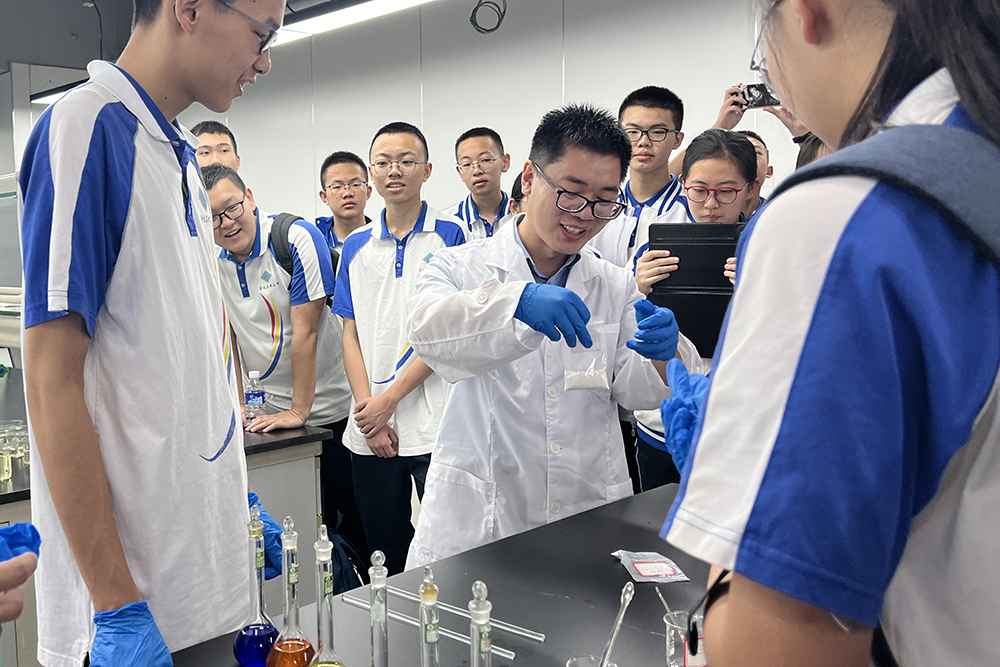 随后,师生们来到实验楼6楼。研究员高雷章老师通过“颜色的秘密”,为大家演示了钒在不同价态下的颜色变化。在高老师的手中,溶液的颜色随着不断加入的试剂而变幻莫测,宛如一场精彩的魔术表演。研究员李政现场邀请了几位同学一起完成实验“妙笔生花”,面对如此奇妙的化学现象,参观现场不时爆发出阵阵惊叹声。