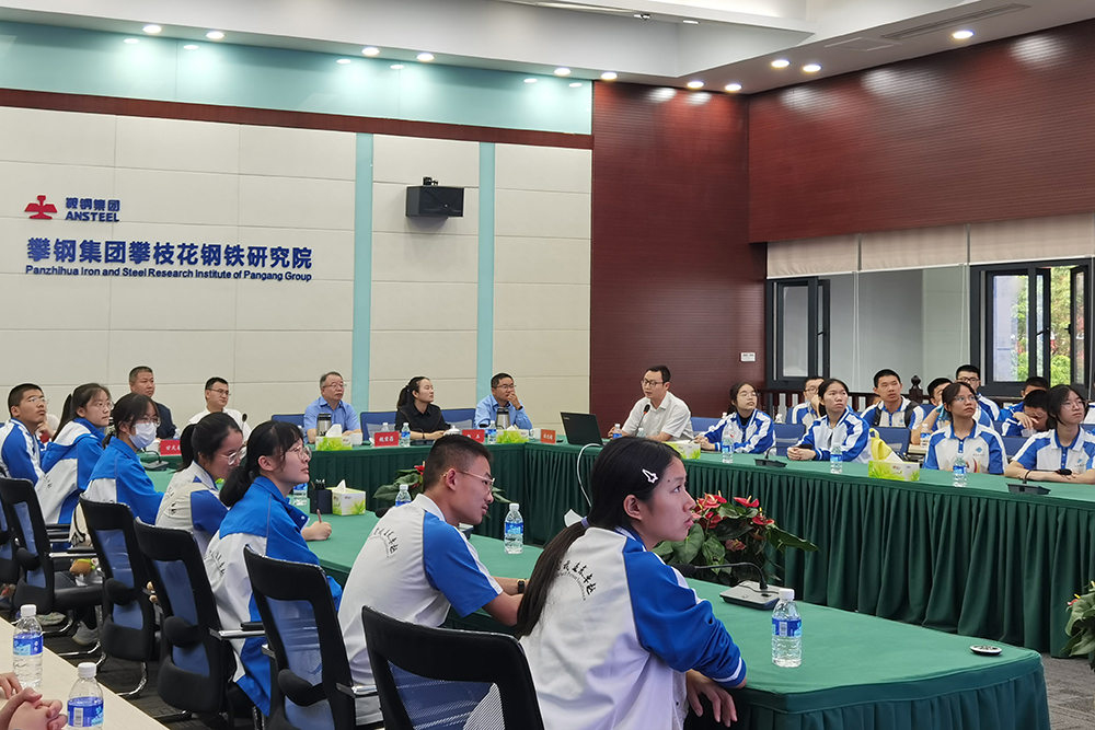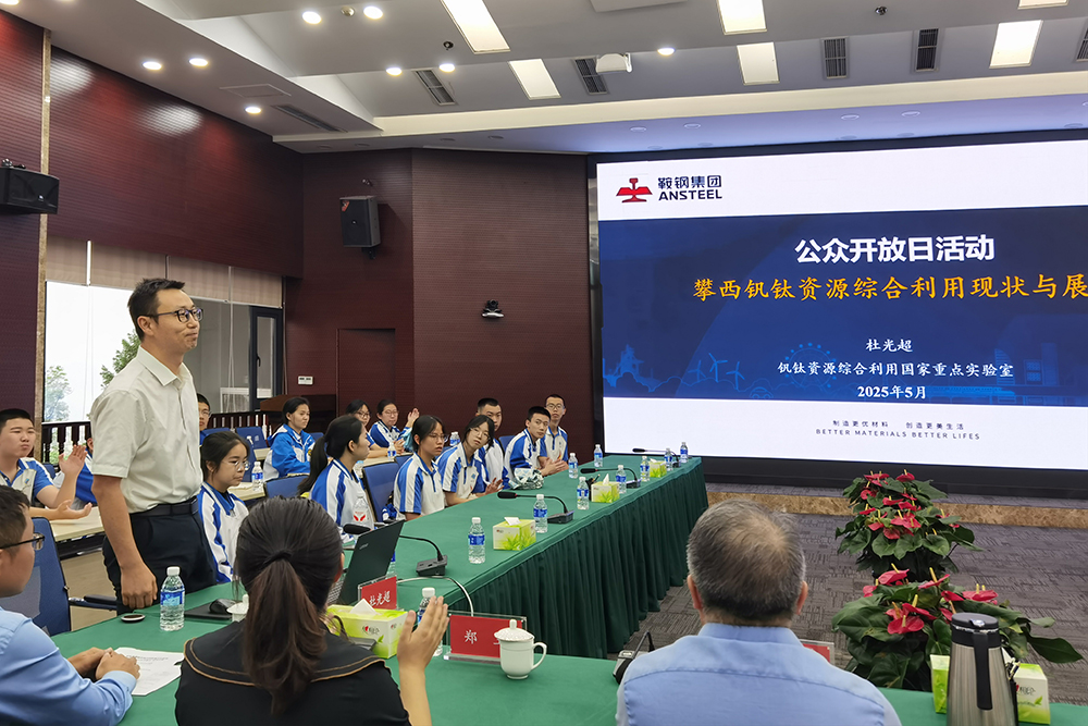 参观结束后,师生们参加了由杜光超博士以“攀西钒钛资源综合利用现状与展望”为主题的讲座。杜博士详细介绍了攀钢研究院的发展历程与成就,并从钒钛的性质、应用领域和资源概况等方面进行了深入浅出的科普。他着重阐述了攀钢的科技报国使命以及未来的发展方向。最后,杜博士对同学们求真知、重实践的科学精神表示赞赏,他勉励同学们在高中阶段要发奋学习,并保持强大的学习能力,因为“科研无止境,学习无止境”!
