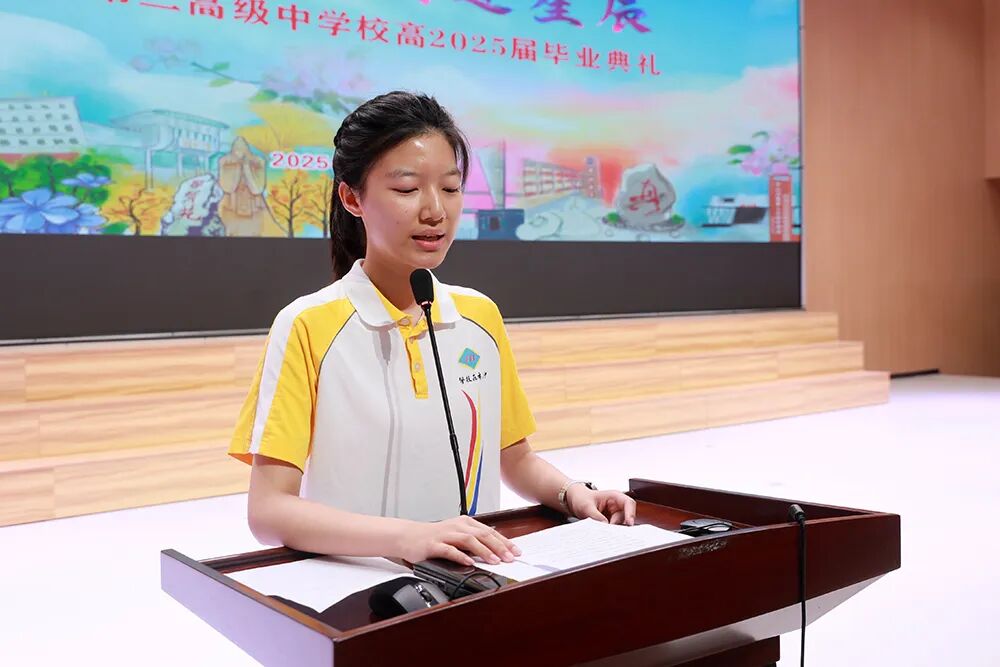 优秀毕业生代表2025届2班左鹂镁、23班郭泓杉同学声情并茂地勾勒了一幅幅校园生活、师生交往场景,带领同学们共忆同心追梦的岁月,回溯了在三中一千多个日夜的淬炼与成长。从稚嫩到成熟,从迷惘到坚定,字字句句浸透着对母校的感恩眷恋。“三载寒窗沐化雨,一朝鲲鹏待长风”,两位同学将未来比作等待展翅的鲲鹏,誓言承载三中精神,勇毅前行,在未来书写属于三中人的责任担当。