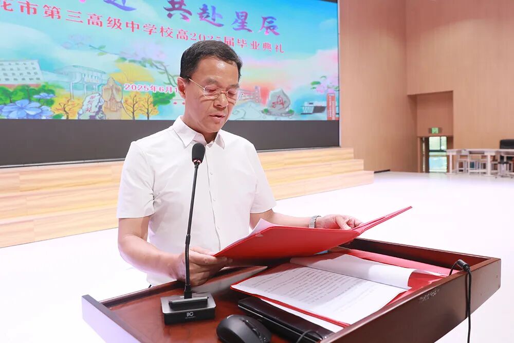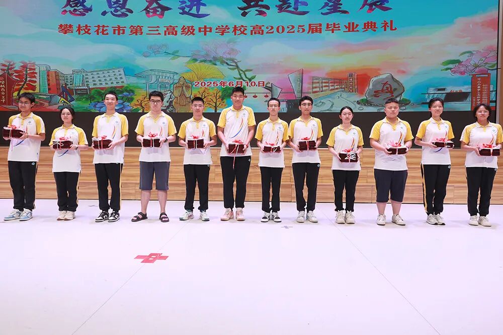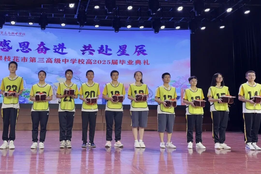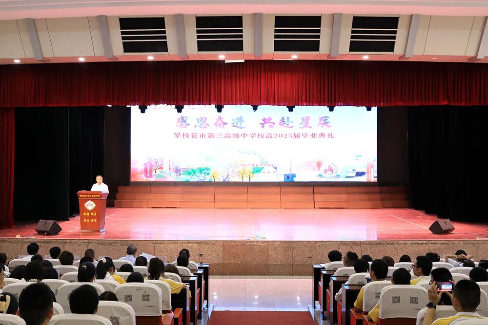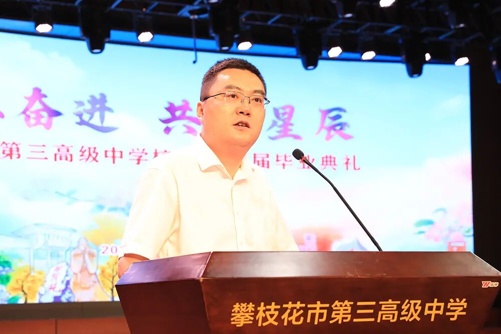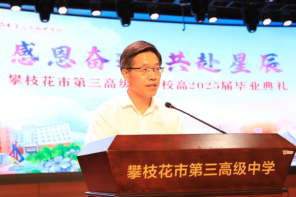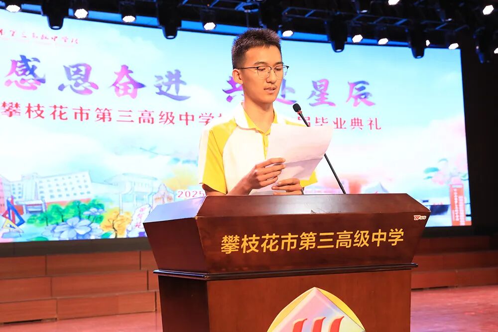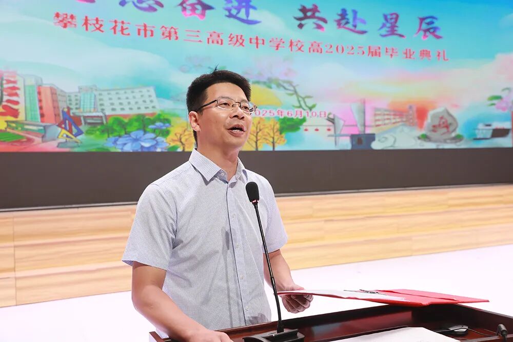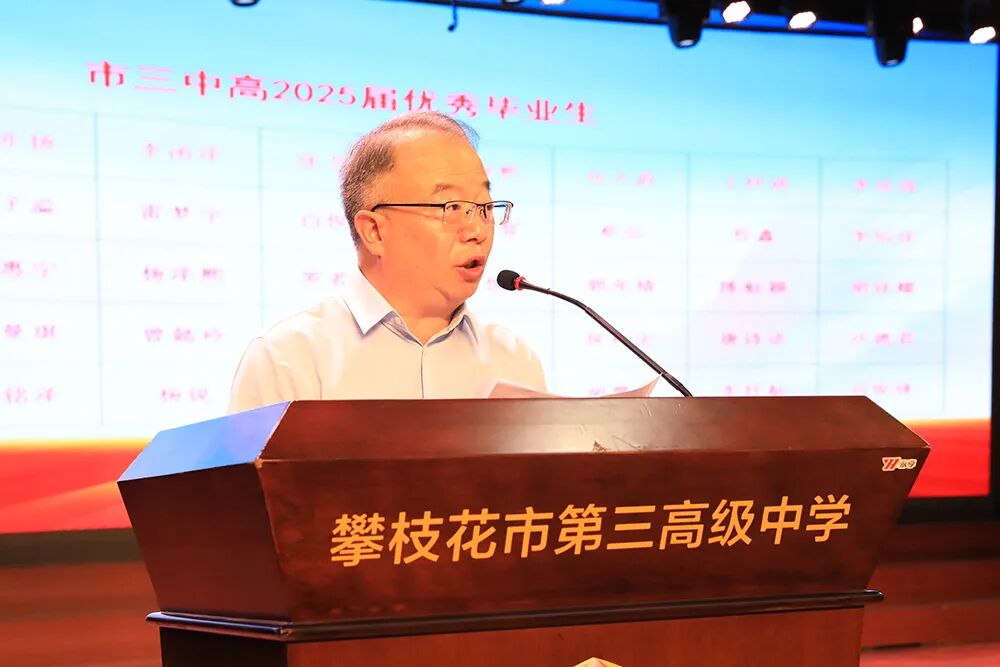 年级主任陈亮、钒钛校区执行主任吴永浩的讲话,是临行前细密的叮咛。他们深情回顾了与全体高三师生并肩作战、风雨同舟的难忘历程,既肯定了三年拼搏结出的累累硕果,也语重心长地提出了殷殷期望:期望学子们永葆求知若渴的初心,永葆“不满足,永追求”的三中精神,以昨日的成绩为基石,向着更辽阔的未来扬帆启航。无论前方是坦途还是荆棘,都要铭记母校赋予的力量,以永不停歇的脚步、永不言弃的信念,勇敢面对未来人生新的挑战。