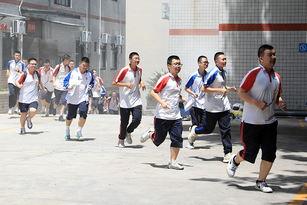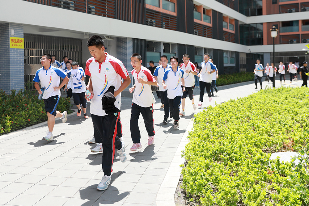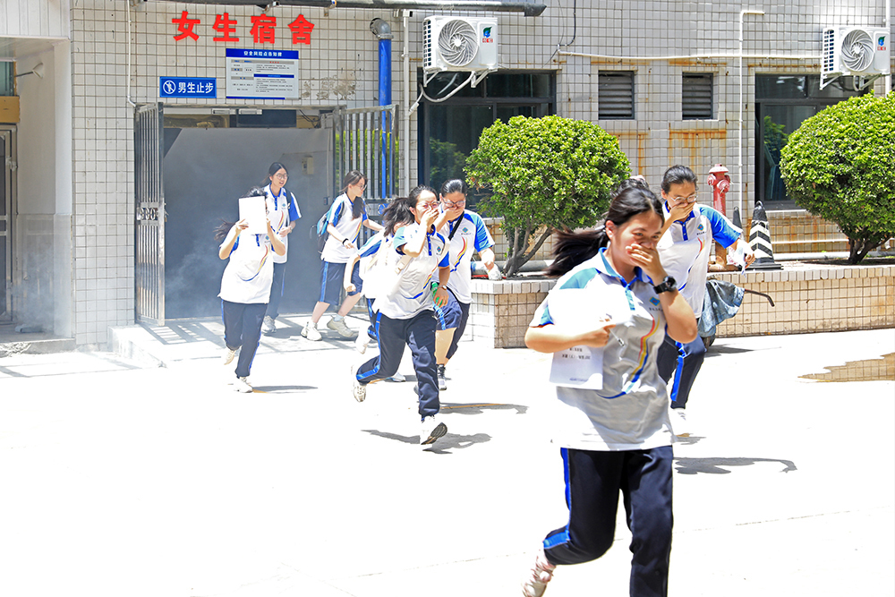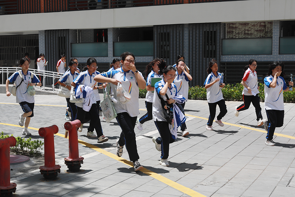 14时20分,随着急促的消防警报声响起,演练正式开始。各宿舍楼的生活老师立即组织学生按照预定方案进行疏散。同学们迅速用湿毛巾捂住口鼻,弯腰低姿,沿着指定疏散路线有序撤离。在楼梯口、拐角处等重点位置,安全引导员有序指挥,确保疏散过程安全顺畅。整个疏散过程紧张有序,两校区师生仅用时不到三分钟就全部安全撤离到指定集合地点。