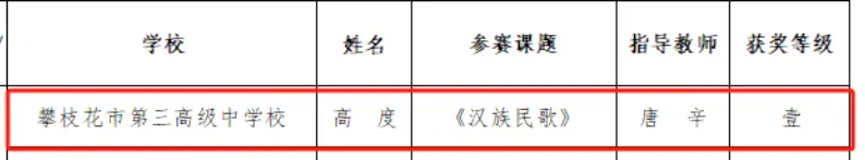 在攀枝花市教育科学研究所主办的2025年音乐课堂教学展评活动中,市三中音乐教研组高度老师凭借扎实的专业功底与创新的教学设计,以高中组总分第一名的优异成绩荣获市级“一等奖”,并将代表攀枝花市出征2025年四川省课堂教学展评活动。