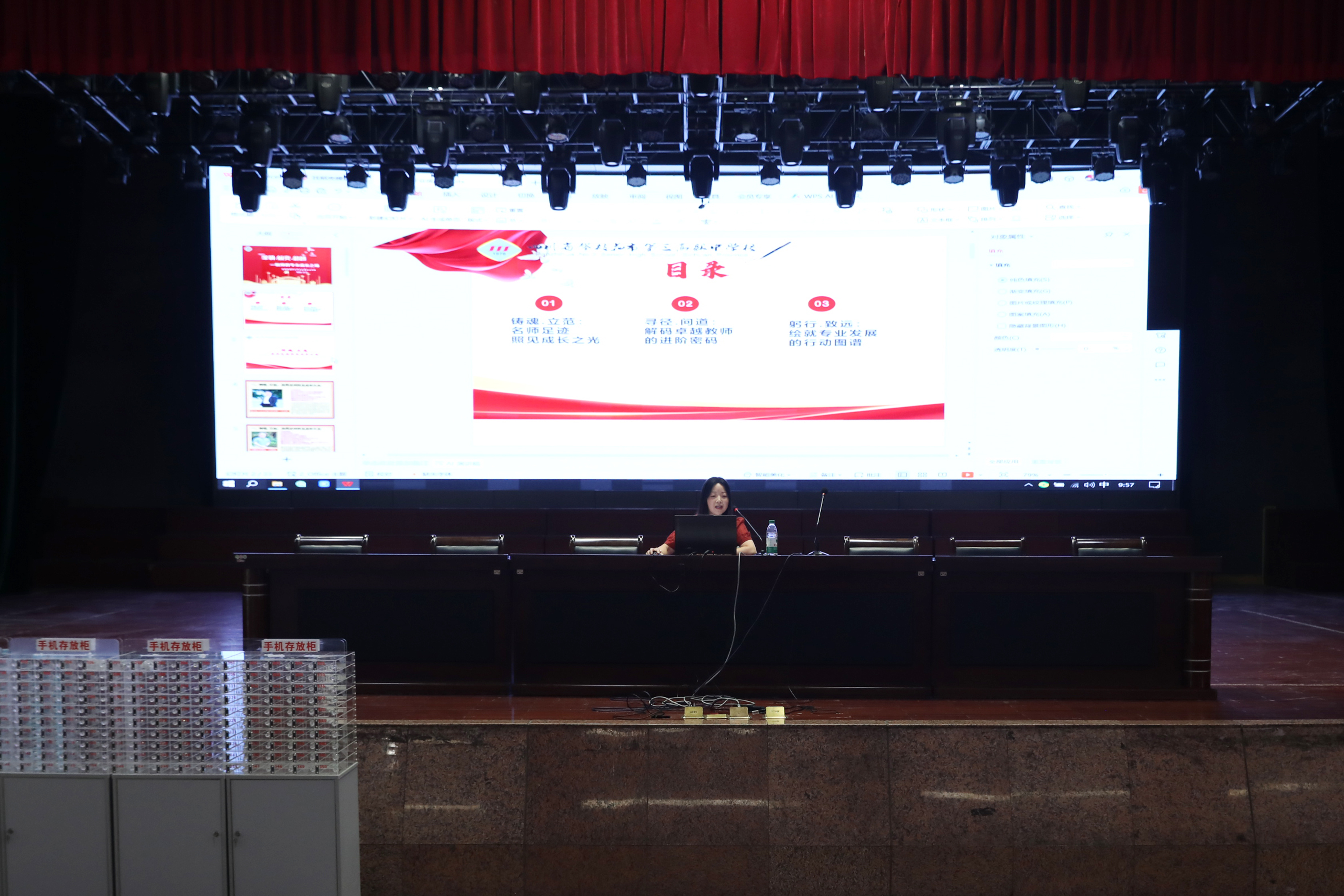 随后,正高级教师、学校政治大教研组组长刘利红老师带来了精彩分享。刘老师通过展示我校教育名师以及全国教育名师们的风采和教育智慧,让大家深刻感受到优秀教师的榜样力量。同时,刘老师结合自身成长经历,详细指出了教师成长的几个阶段,并针对每个阶段给出了切实可行的成长建议,鼓励大家追随名师足迹,在专业化成长路上不断精进。