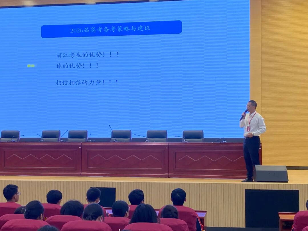 讲座中,高俊鹏老师用详实的数据解读了2025年高考全国招录情况、云南省招录情况和丽江学子得天独厚的优势,向全体师生传递了决胜高考的坚定信念。针对新高考方向、命题解读、备考规划、精准施策等方面用10个关键词从多个维度给出科学备考的策略和建议。